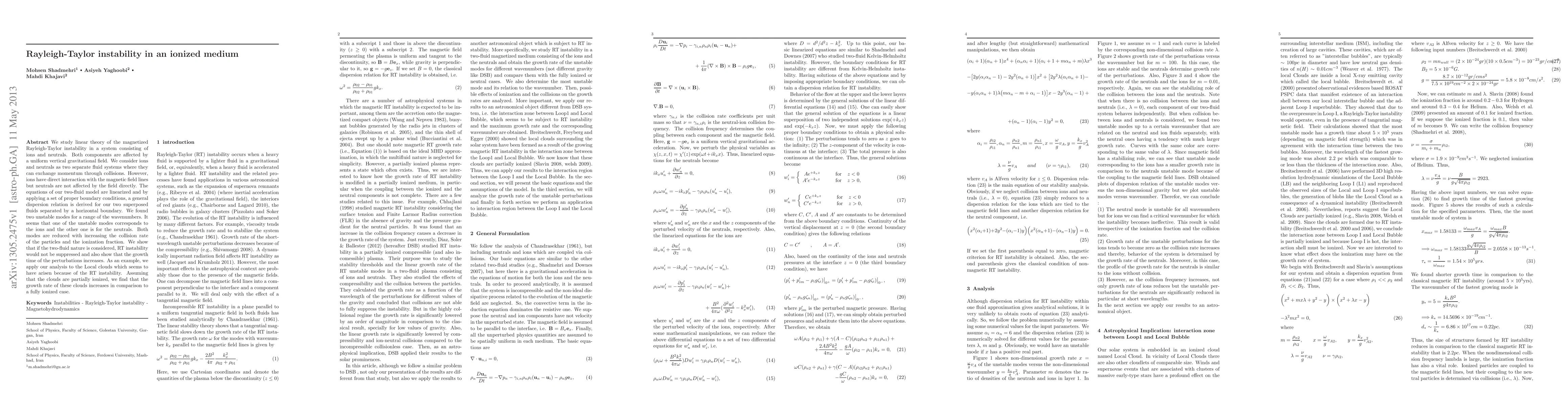 This paper investigates the linear theory of the magnetized Rayleigh-Taylor instability in an ionized medium consisting of ions and neutrals under a gravitational field. The study reveals two unstable modes, with growth rates reduced by increased collision rates and ionization fraction, and applies the findings to partially ionized Local clouds.