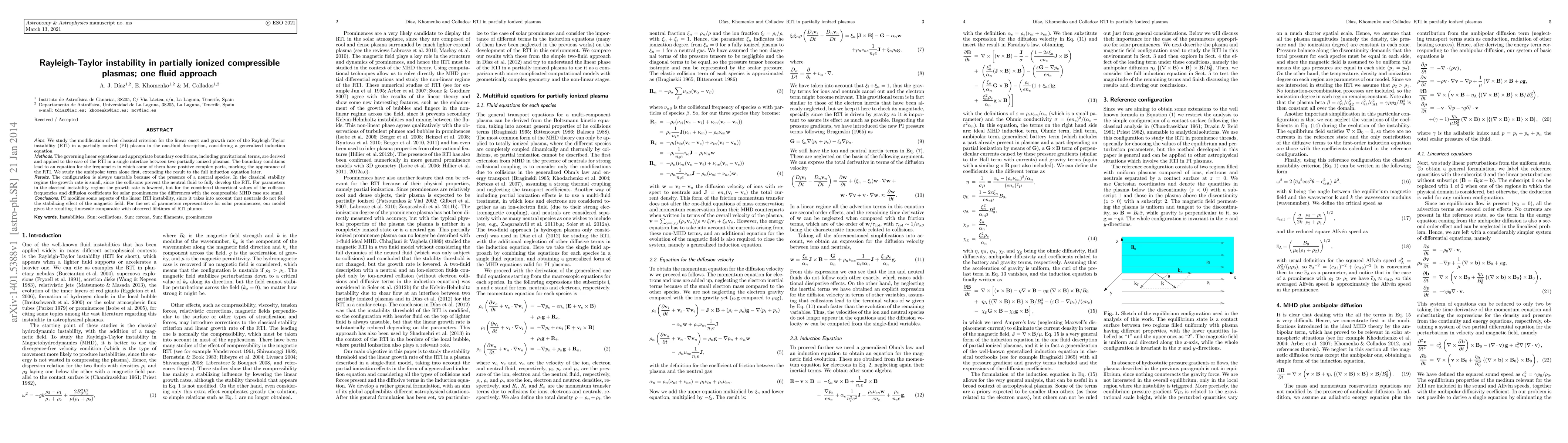 This paper investigates the linear onset and growth rate of Rayleigh-Taylor instability in partially ionized plasmas using a one-fluid approach, finding that the presence of neutral species leads to instability, while collisions limit the growth rate. The study concludes that partial ionization modifies the classical RTI behavior by excluding the neutral fluid's magnetic field stabilization effect.