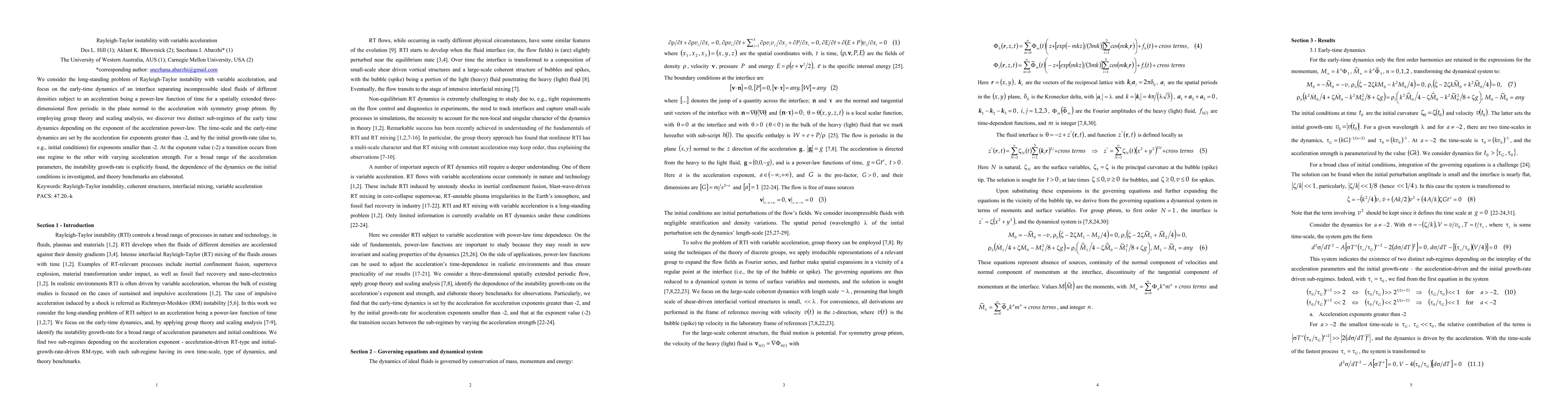 The research employs group theory and scaling analysis to study the Rayleigh-Taylor instability with variable acceleration, focusing on the early-time dynamics of an interface separating incompressible ideal fluids of different densities under a power-law time-dependent acceleration.