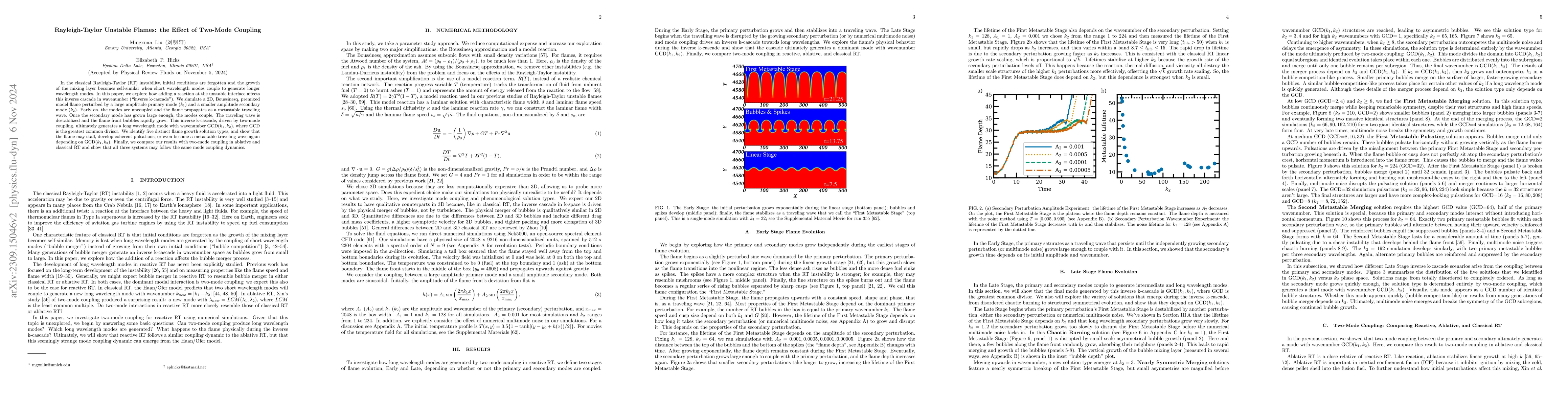 This paper investigates the Rayleigh-Taylor instability in reacting flames using 2D DNS, revealing how flame reactions modify instability behavior. The study identifies five distinct flame growth solutions, showing that coupled perturbations can generate a dominant tertiary mode, leading to unique flame dynamics not observed in nonreacting RT.