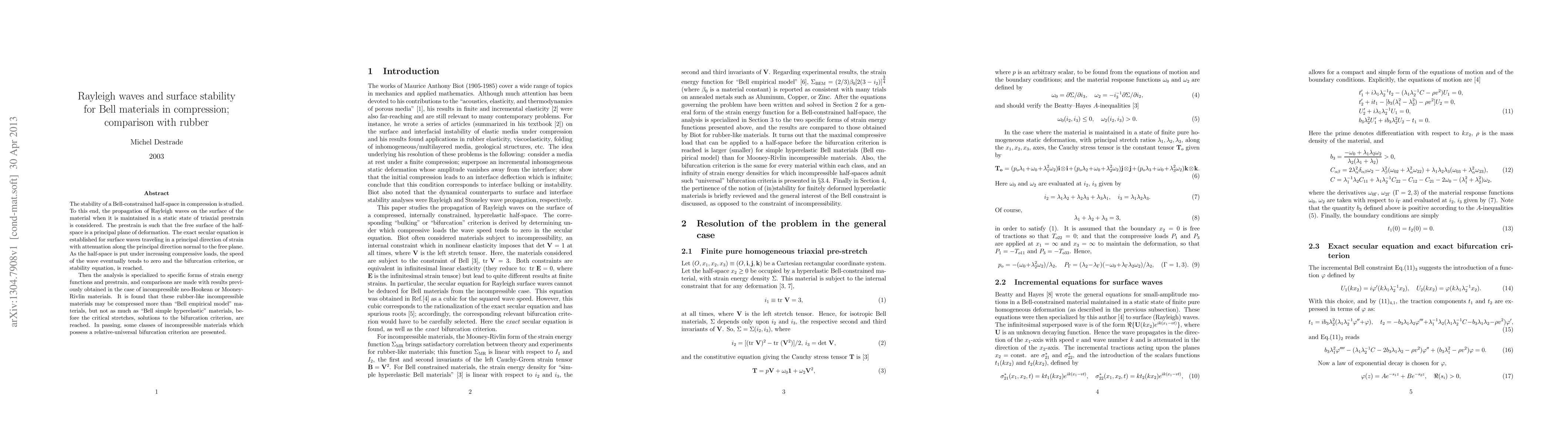The stability of a Bell-constrained half-space in compression is studied. To this end, the propagation of Rayleigh waves on the surface of the material when it is maintained in a static state of triaxial prestrain is considered. The prestrain is such that the free surface of the half-space is a principal plane of deformation. The exact secular equation is established for surface waves traveling in a principal direction of strain with attenuation along the principal direction normal to the free plane. As the half-space is put under increasing compressive loads, the speed of the wave eventually tends to zero and the bifurcation criterion, or stability equation, is reached. Then the analysis is specialized to specific forms of strain energy functions and prestrain, and comparisons are made with results previously obtained in the case of incompressible neo-Hookean or Mooney-Rivlin materials. It is found that these rubber-like incompressible materials may be compressed more than "Bell empirical model" materials, but not as much as "Bell simple hyperelastic" materials, before the critical stretches, solutions to the bifurcation criterion, are reached. In passing, some classes of incompressible materials which possess a relative-universal bifurcation criterion are presented.