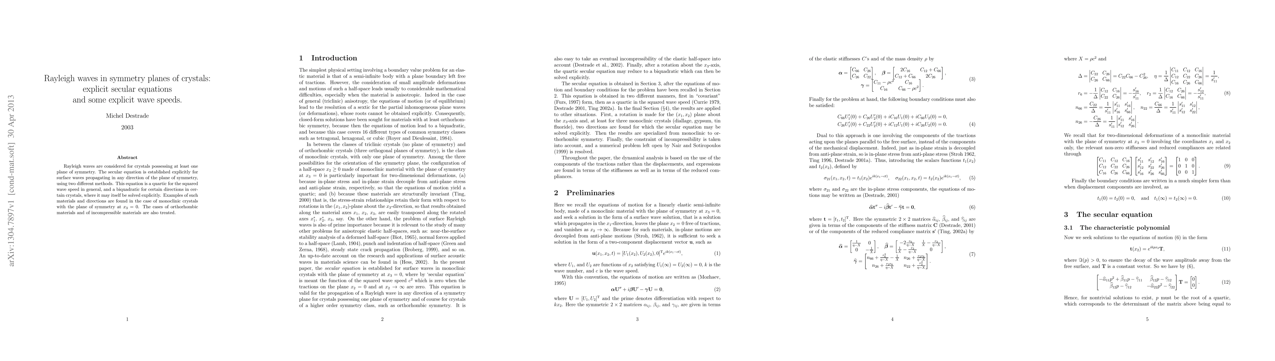 This paper derives explicit secular equations for Rayleigh waves in crystals with symmetry planes, showing the wave speed equations can be quartic or biquadratic depending on the direction of wave propagation. Specific examples for monoclinic crystals and other materials are provided to illustrate explicit solutions.