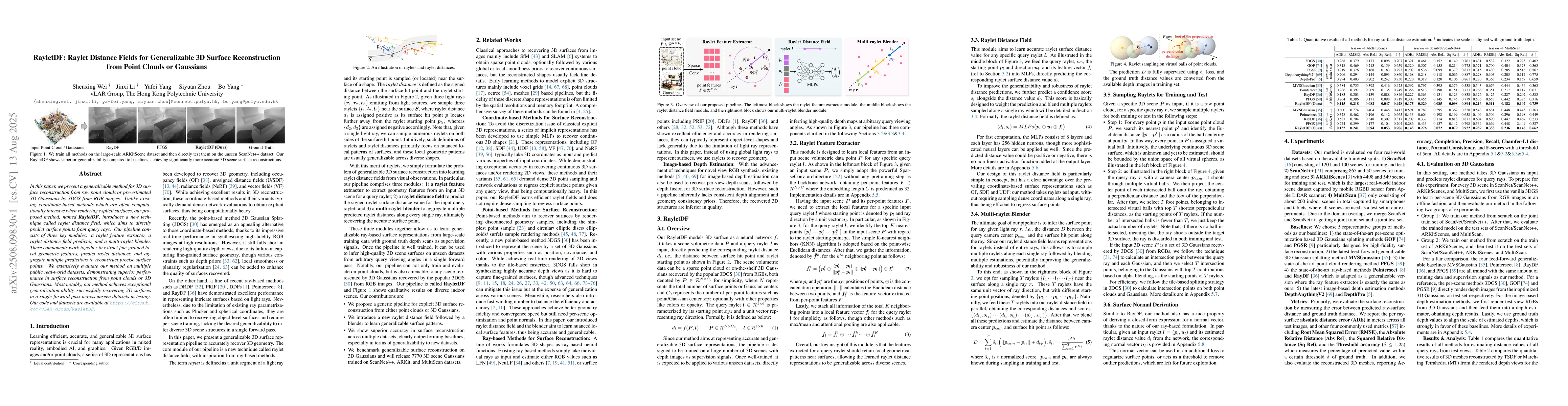 In this paper, we present a generalizable method for 3D surface reconstruction from raw point clouds or pre-estimated 3D Gaussians by 3DGS from RGB images. Unlike existing coordinate-based methods which are often computationally intensive when rendering explicit surfaces, our proposed method, named RayletDF, introduces a new technique called raylet distance field, which aims to directly predict surface points from query rays. Our pipeline consists of three key modules: a raylet feature extractor, a raylet distance field predictor, and a multi-raylet blender. These components work together to extract fine-grained local geometric features, predict raylet distances, and aggregate multiple predictions to reconstruct precise surface points. We extensively evaluate our method on multiple public real-world datasets, demonstrating superior performance in surface reconstruction from point clouds or 3D Gaussians. Most notably, our method achieves exceptional generalization ability, successfully recovering 3D surfaces in a single-forward pass across unseen datasets in testing.