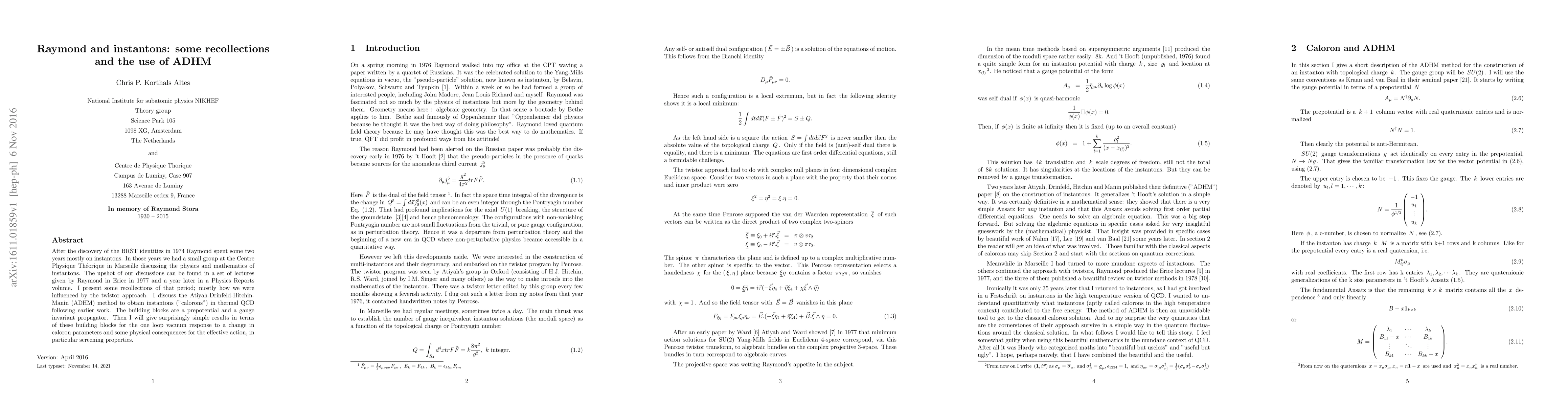 After the discovery of the BRST identities in 1974 Raymond spent some two years mostly on instantons. In those years we had a small group at the Centre Physique Th\'eorique in Marseille discussing the physics and mathematics of instantons. The upshot of our discussions can be found in a set of lectures given by Raymond in Erice in 1977 and a year later in a Physics Reports volume. I present some recollections of that period; mostly how we were influenced by the twistor approach. I discuss the Atiyah-Drinfeld-Hitchin-Manin (ADHM) method to obtain instantons ("calorons") in thermal QCD following earlier work. The building blocks are a prepotential and a gauge invariant propagator. Then I will give surprisingly simple results in terms of these building blocks for the one loop vacuum response to a change in caloron parameters and some physical consequences for the effective action, in particular screening properties.