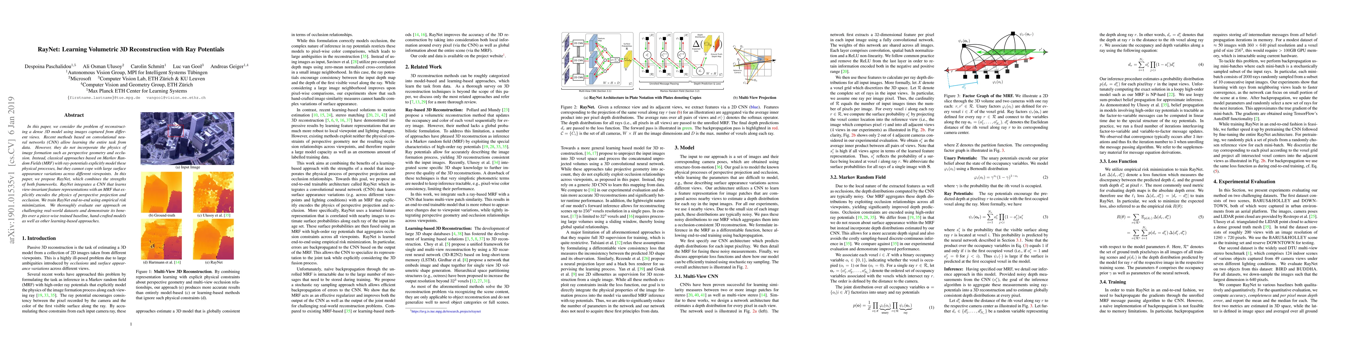In this paper, we consider the problem of reconstructing a dense 3D model using images captured from different views. Recent methods based on convolutional neural networks (CNN) allow learning the entire task from data. However, they do not incorporate the physics of image formation such as perspective geometry and occlusion. Instead, classical approaches based on Markov Random Fields (MRF) with ray-potentials explicitly model these physical processes, but they cannot cope with large surface appearance variations across different viewpoints. In this paper, we propose RayNet, which combines the strengths of both frameworks. RayNet integrates a CNN that learns view-invariant feature representations with an MRF that explicitly encodes the physics of perspective projection and occlusion. We train RayNet end-to-end using empirical risk minimization. We thoroughly evaluate our approach on challenging real-world datasets and demonstrate its benefits over a piece-wise trained baseline, hand-crafted models as well as other learning-based approaches.