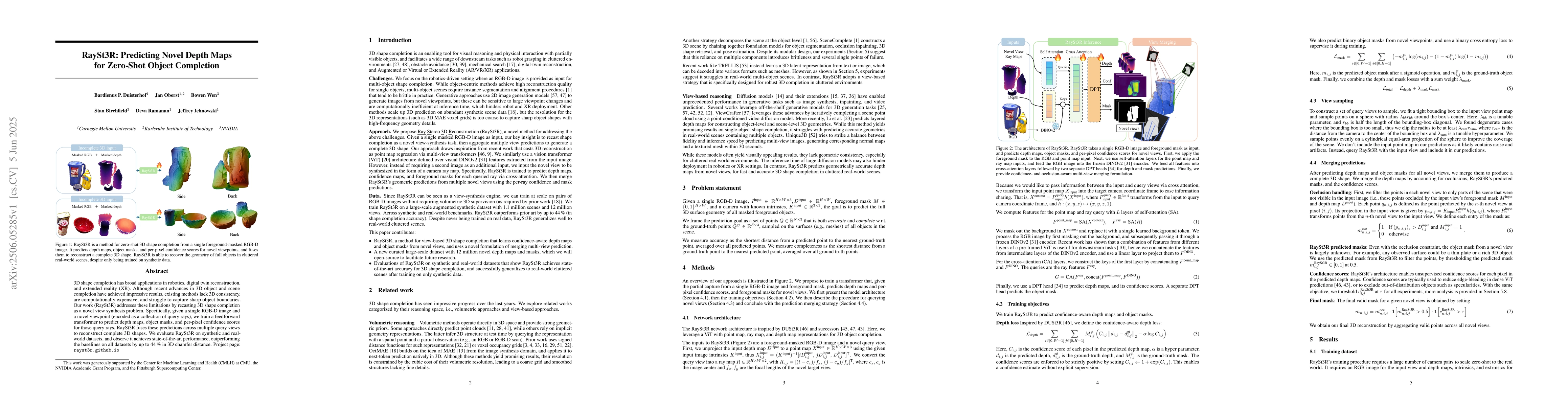 RaySt3R recasts 3D shape completion as a novel view synthesis problem, using a feedforward transformer to predict depth maps, object masks, and confidence scores from a single RGB-D image and novel viewpoint (query rays). It fuses predictions across multiple query views for complete 3D shape reconstruction.