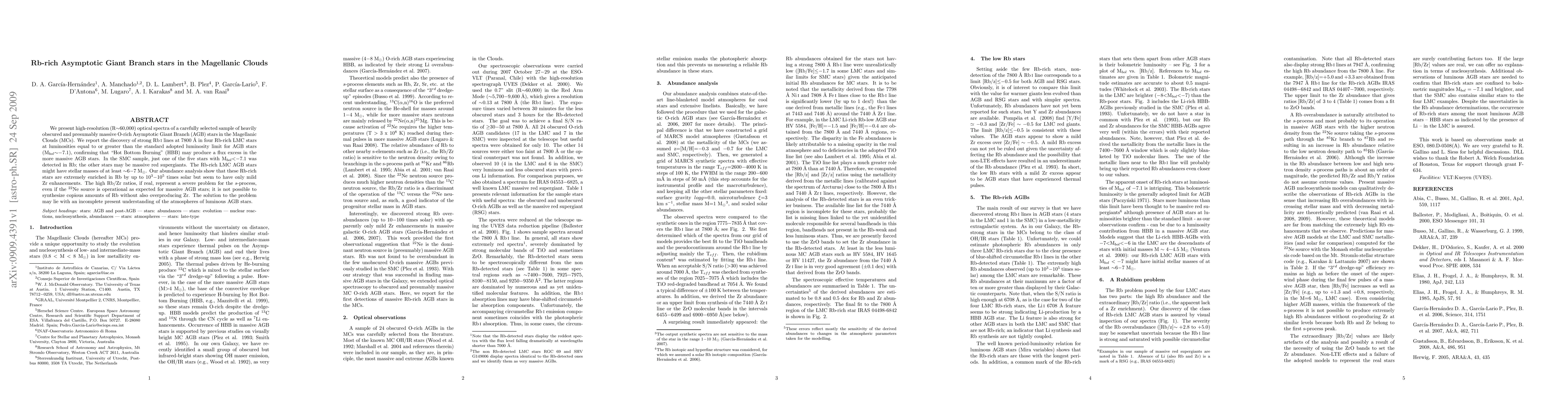 This study identifies strong Rb I lines in four Rb-rich Asymptotic Giant Branch (AGB) stars in the Large Magellanic Cloud (LMC), suggesting "Hot Bottom Burning" (HBB) produces a flux excess in massive AGB stars. In contrast, only one Rb-rich star was found in the Small Magellanic Cloud (SMC). The Rb-rich LMC stars show extreme Rb enrichment but only mild Zr enhancements, posing a challenge for the s-process nucleosynthesis model.