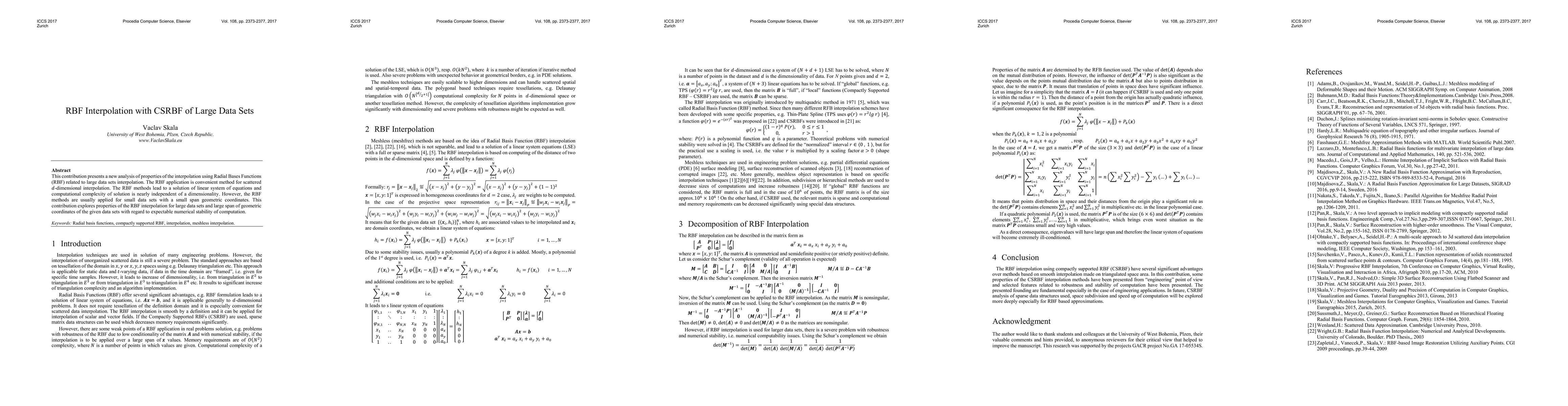 This contribution presents a new analysis of properties of the interpolation using Radial Bases Functions (RBF) related to large data sets interpolation. The RBF application is convenient method for scattered d-dimensional interpolation. The RBF methods lead to a solution of linear system of equations and computational complexity of solution is nearly independent of a dimensionality. However, the RBF methods are usually applied for small data sets with a small span geometric coordinates. This contribution explores properties of the RBF interpolation for large data sets and large span of geometric coordinates of the given data sets with regard to expectable numerical stability of computation.