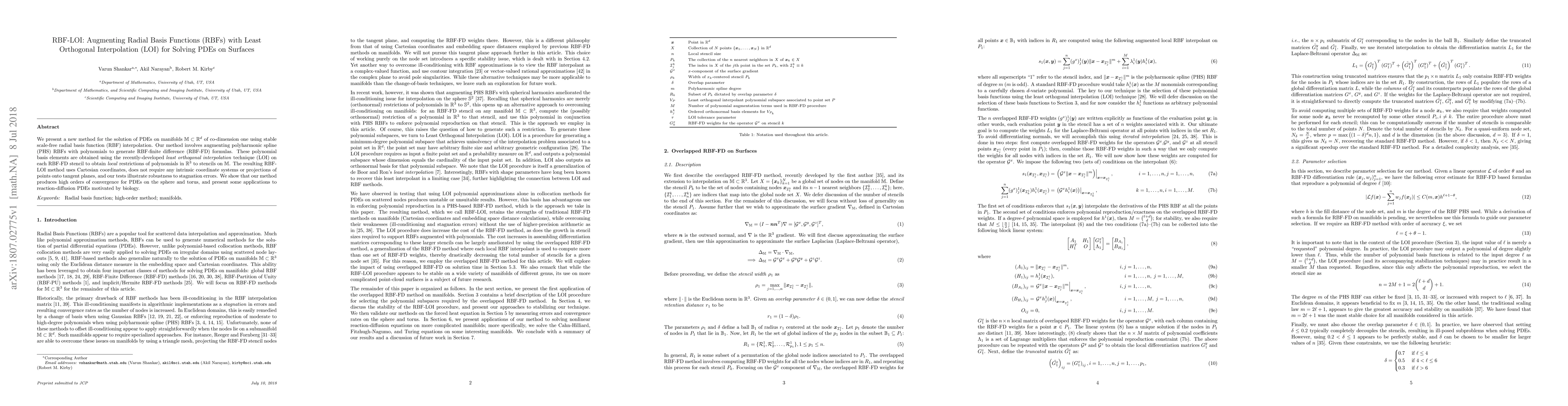 This paper introduces RBF-LOI, a method combining radial basis functions with least orthogonal interpolation to solve PDEs on manifold surfaces. The approach leverages polyharmonic splines and LOI to achieve high convergence rates and robustness, demonstrated through applications to reaction-diffusion equations in biological contexts.