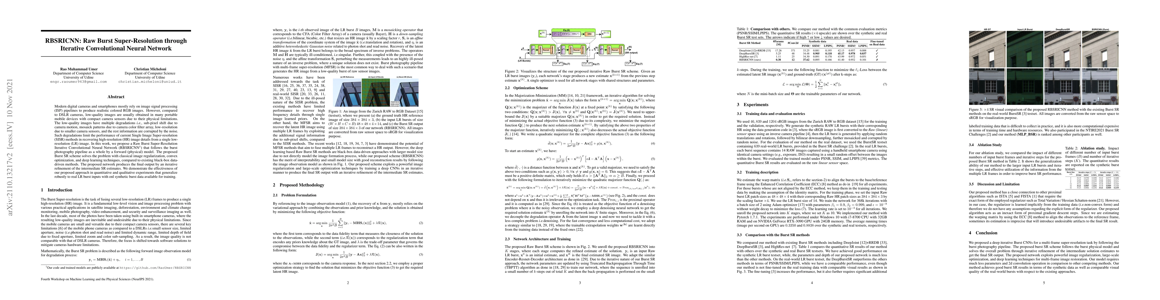 The paper proposes a Raw Burst Super-Resolution Iterative Convolutional Neural Network (RBSRICNN) to improve image quality from low-resolution mobile images by addressing multiple degradations through iterative refinement. The method combines physical modeling, optimization, and deep learning to outperform existing Single Image Super-resolution (SISR) techniques.