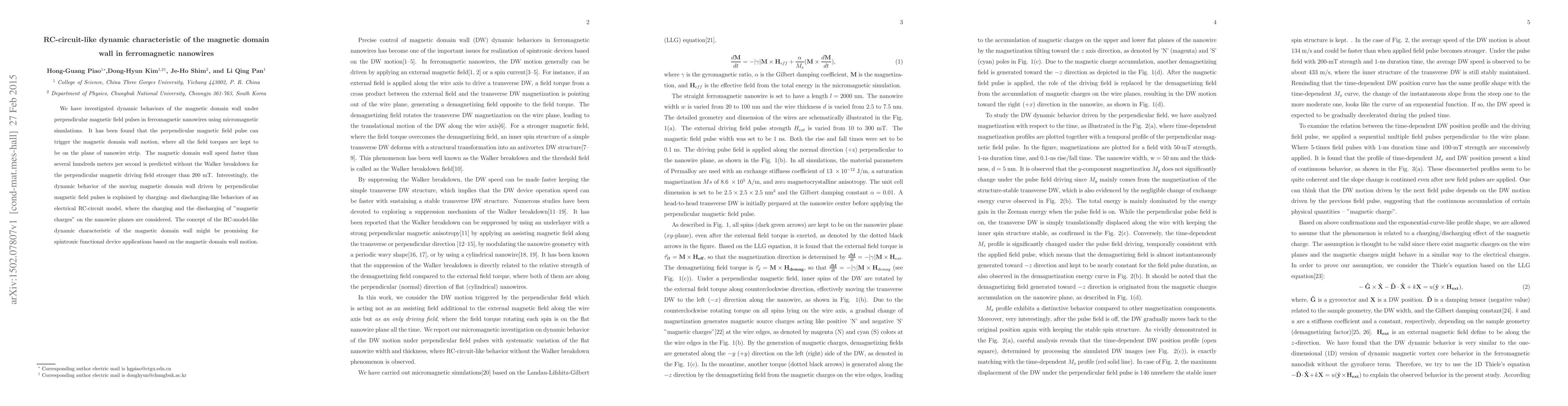 This research investigates the dynamic behavior of magnetic domain walls in ferromagnetic nanowires under perpendicular magnetic field pulses, finding high-speed motion without Walker breakdown. The study proposes an RC-circuit model to explain the charging and discharging processes of "magnetic charges," suggesting potential applications for spintronic devices.