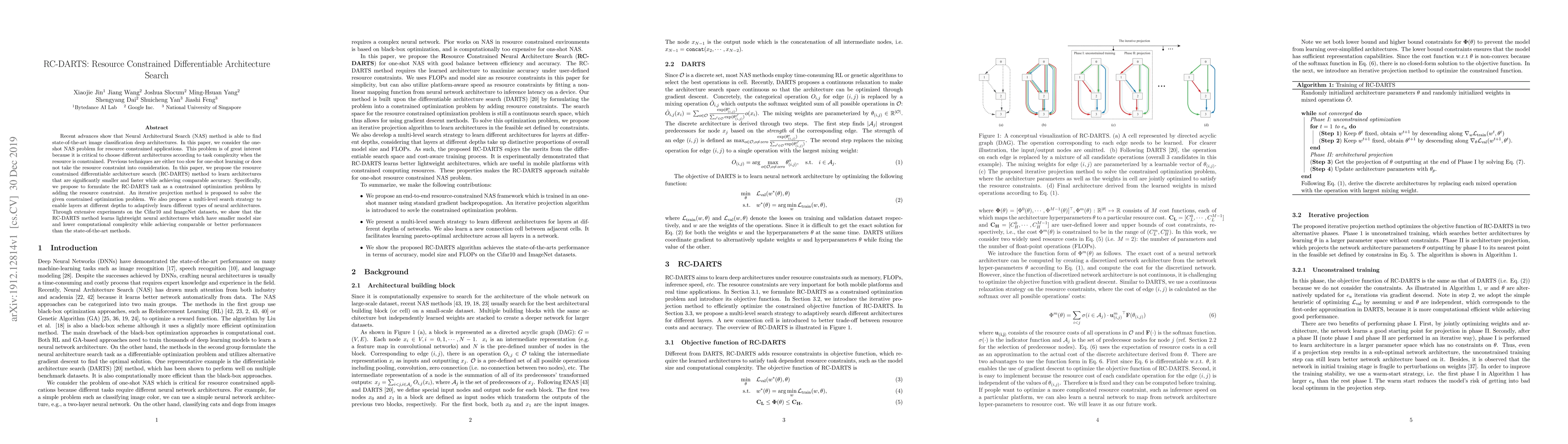 Recent advances show that Neural Architectural Search (NAS) method is able to find state-of-the-art image classification deep architectures. In this paper, we consider the one-shot NAS problem for resource constrained applications. This problem is of great interest because it is critical to choose different architectures according to task complexity when the resource is constrained. Previous techniques are either too slow for one-shot learning or does not take the resource constraint into consideration. In this paper, we propose the resource constrained differentiable architecture search (RC-DARTS) method to learn architectures that are significantly smaller and faster while achieving comparable accuracy. Specifically, we propose to formulate the RC-DARTS task as a constrained optimization problem by adding the resource constraint. An iterative projection method is proposed to solve the given constrained optimization problem. We also propose a multi-level search strategy to enable layers at different depths to adaptively learn different types of neural architectures. Through extensive experiments on the Cifar10 and ImageNet datasets, we show that the RC-DARTS method learns lightweight neural architectures which have smaller model size and lower computational complexity while achieving comparable or better performances than the state-of-the-art methods.