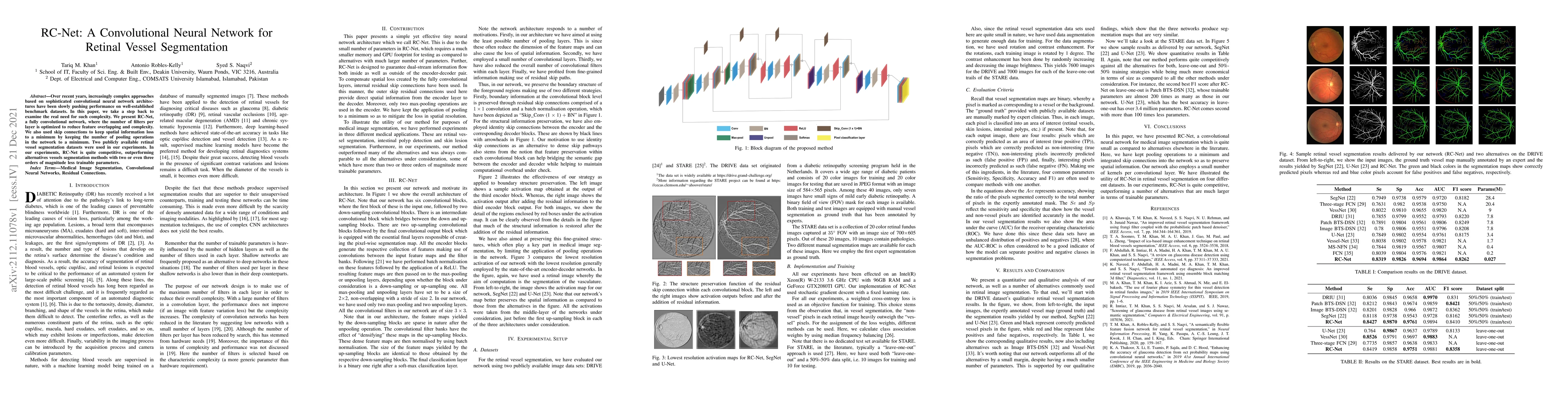 RC-Net is a streamlined convolutional neural network designed for retinal vessel segmentation, optimizing the number of filters to reduce complexity and using skip connections to minimize spatial information loss. It outperforms other methods on benchmark datasets with significantly fewer trainable parameters.