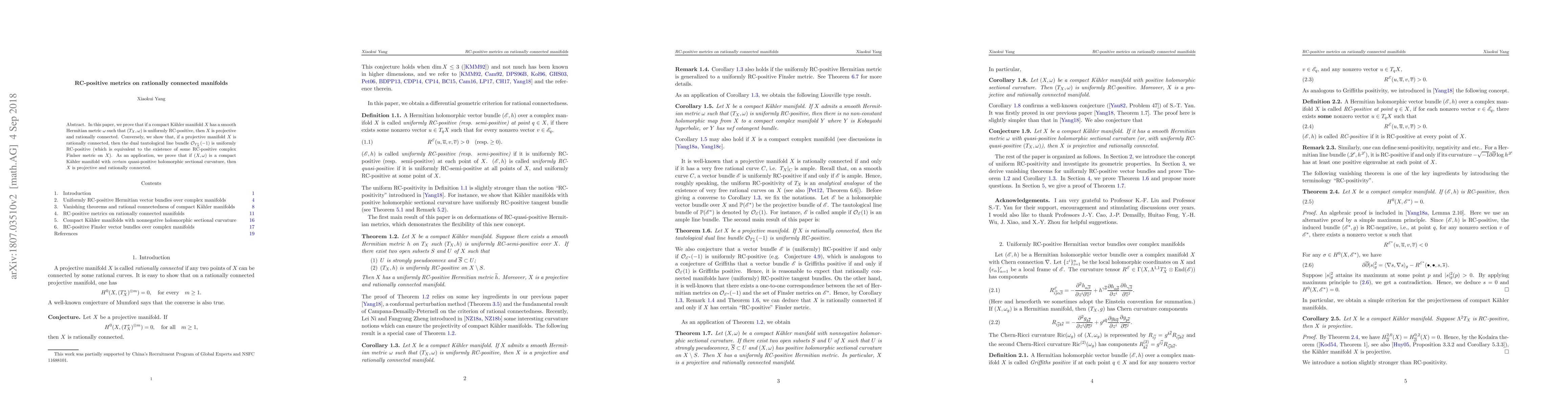 In this paper, we prove that if a compact K\"ahler manifold $X$ has a smooth Hermitian metric $\omega$ such that $(T_X,\omega)$ is uniformly RC-positive, then $X$ is projective and rationally connected. Conversely, we show that, if a projective manifold $X$ is rationally connected, then the tautological line bundle $\mathscr{O}_{T_X^*}(-1)$ is uniformly RC-positive (which is equivalent to the existence of some RC-positive complex Finlser metric on $X$). As an application, we prove that if $(X,\omega)$ is a compact K\"ahler manifold with certain quasi-positive holomorphic sectional curvature, then $X$ is projective and rationally connected.