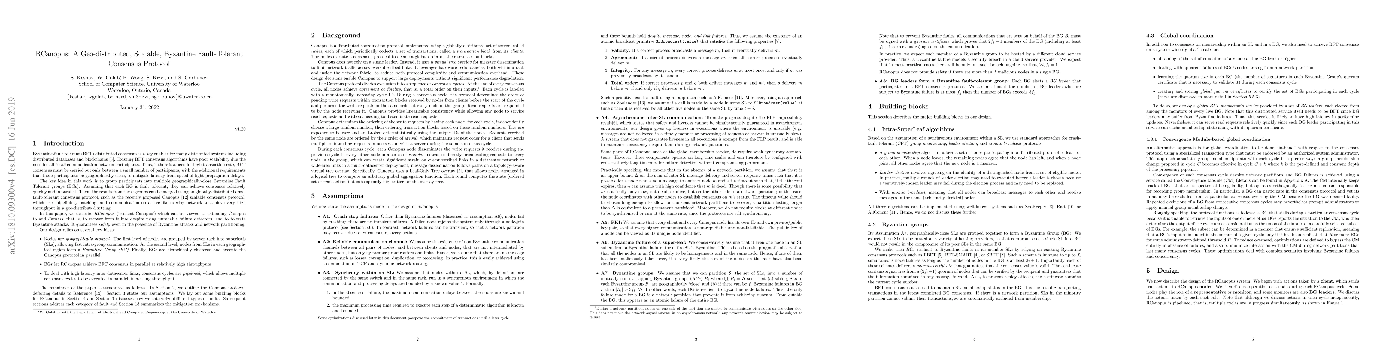 Distributed consensus is a key enabler for many distributed systems including distributed databases and blockchains. Canopus is a scalable distributed consensus protocol that ensures that live nodes in a system agree on an ordered sequence of operations (called transactions). Unlike most prior consensus protocols, Canopus does not rely on a single leader. Instead, it uses a virtual tree overlay for message dissemination to limit network traffic across oversubscribed links. It leverages hardware redundancies, both within a rack and inside the network fabric, to reduce both protocol complexity and communication overhead. These design decisions enable Canopus to support large deployments without significant performance degradation. The existing Canopus protocol is resilient in the face of node and communication failures, but its focus is primarily on performance, so does not respond well to other types of failures. For example, the failure of a single rack of servers causes all live nodes to stall. The protocol is also open to attack by Byzantine nodes, which can cause different live nodes to conclude the protocol with different transaction orders. In this paper, we describe RCanopus (`resilent Canopus') which extends Canopus to add liveness, that is, allowing live nodes to make progress, when possible, despite many types of failures. This requires RCanopus to accurately detect and recover from failure despite using unreliable failure detectors, and tolerance of Byzantine attacks. Second, RCanopus guarantees safety, that is, agreement amongst live nodes of transaction order, in the presence of Byzantine attacks and network partitioning.