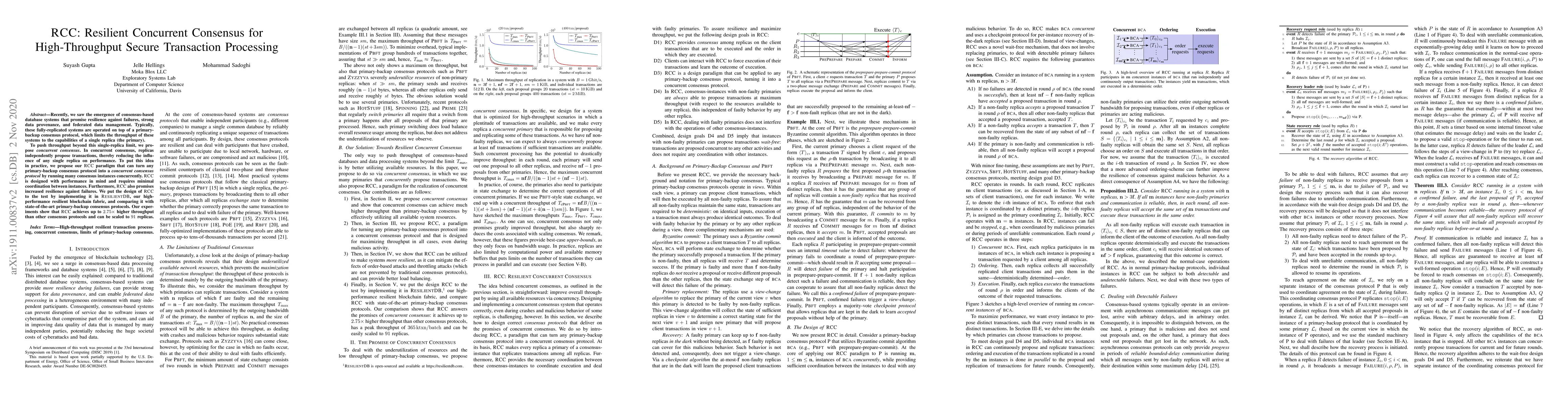 Recently, we saw the emergence of consensus-based database systems that promise resilience against failures, strong data provenance, and federated data management. Typically, these fully-replicated systems are operated on top of a primary-backup consensus protocol, which limits the throughput of these systems to the capabilities of a single replica (the primary). To push throughput beyond this single-replica limit, we propose concurrent consensus. In concurrent consensus, replicas independently propose transactions, thereby reducing the influence of any single replica on performance. To put this idea in practice, we propose our RCC paradigm that can turn any primary-backup consensus protocol into a concurrent consensus protocol by running many consensus instances concurrently. RCC is designed with performance in mind and requires minimal coordination between instances. Furthermore, RCC also promises increased resilience against failures. We put the design of RCC to the test by implementing it in ResilientDB, our high-performance resilient blockchain fabric, and comparing it with state-of-the-art primary-backup consensus protocols. Our experiments show that RCC achieves up to 2.75x higher throughput than other consensus protocols and can be scaled to 91 replicas.