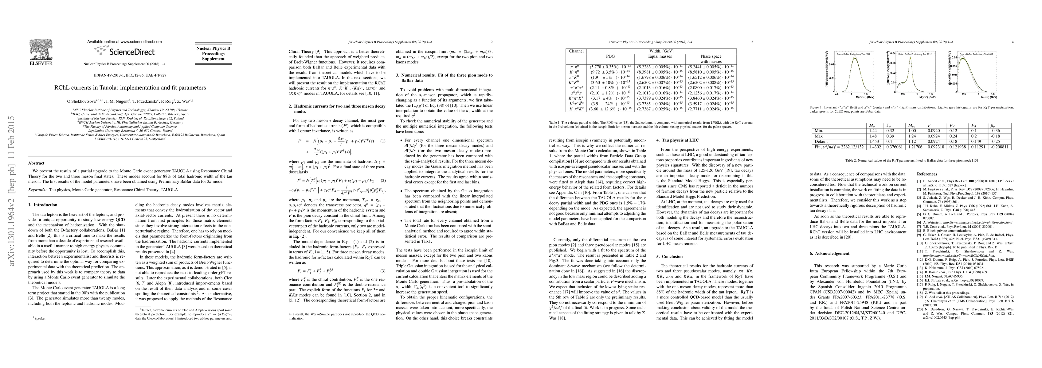 We present the results of a partial upgrade to the Monte Carlo event generator TAUOLA using Resonance Chiral Theory for the two and three meson final states. These modes account for 88% of total hadronic width of the tau meson. The first results of the model parameters have been obtained using Preliminary BaBar data for the three pion mode.
