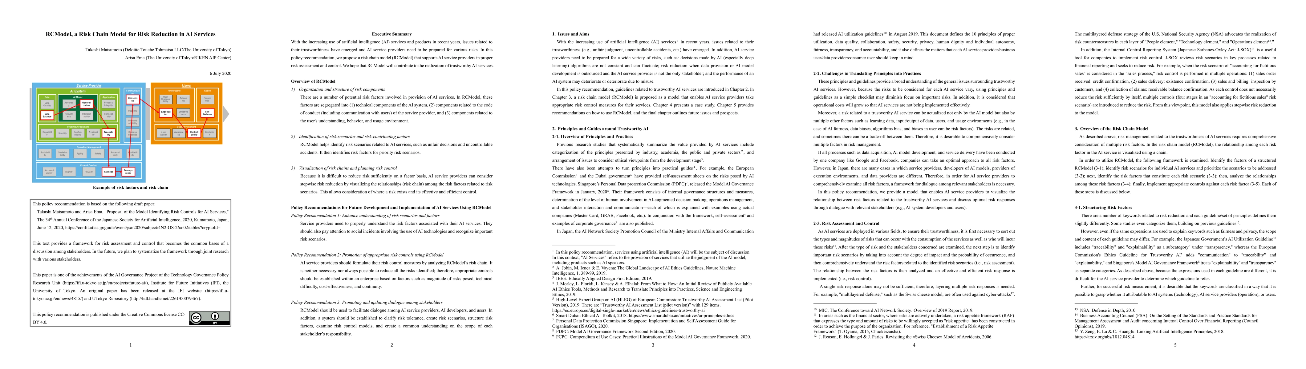With the increasing use of artificial intelligence (AI) services and products in recent years, issues related to their trustworthiness have emerged and AI service providers need to be prepared for various risks. In this policy recommendation, we propose a risk chain model (RCModel) that supports AI service providers in proper risk assessment and control. We hope that RCModel will contribute to the realization of trustworthy AI services.