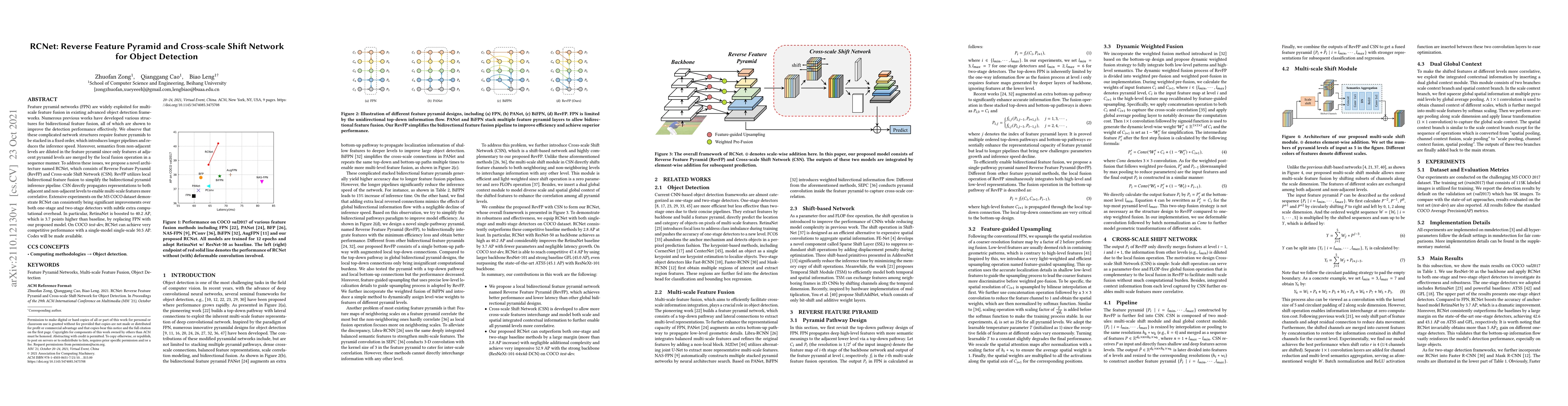 The research introduces RCNet, a novel object detection architecture that simplifies feature fusion and improves inference speed. RCNet comprises Reverse Feature Pyramid (RevFP) for local bidirectional fusion and Cross-scale Shift Network (CSN) for direct representation propagation to adjacent and non-adjacent levels, leading to enhanced multi-scale feature correlation. Experiments on MS COCO dataset show RCNet significantly boosts both one-stage and two-stage detectors' performance with minor computational overhead, improving RetinaNet's AP to 40.2 from 36.5.