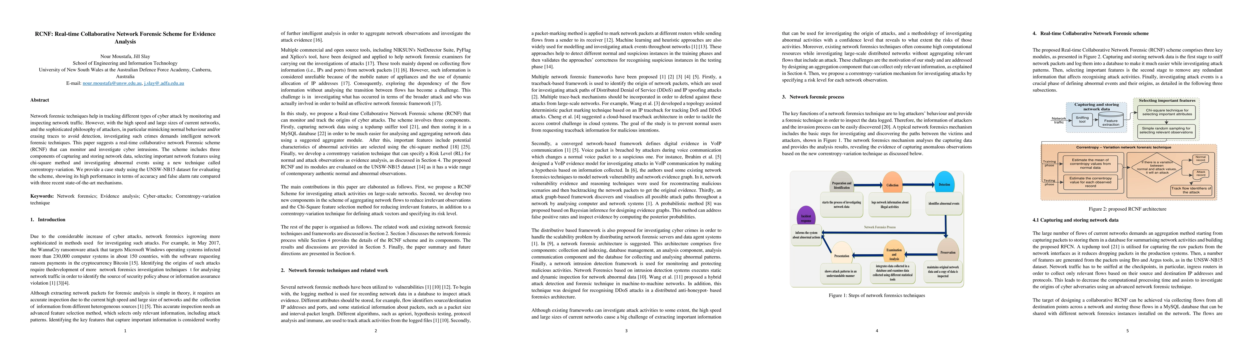 The paper proposes a real-time collaborative network forensic scheme (RCNF) for monitoring and investigating cyber intrusions, utilizing data capturing, feature selection via chi-square, and anomaly detection with correntropy-variation. Evaluation using the UNSW-NB15 dataset demonstrates RCNF's superior accuracy and lower false alarm rate compared to recent state-of-the-art methods.