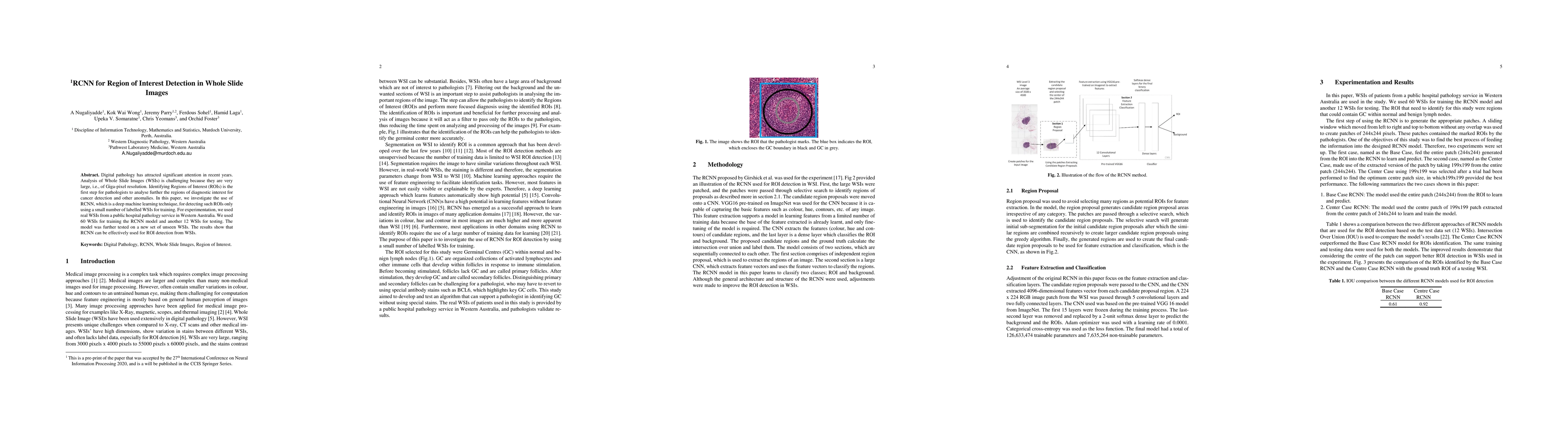 Digital pathology has attracted significant attention in recent years. Analysis of Whole Slide Images (WSIs) is challenging because they are very large, i.e., of Giga-pixel resolution. Identifying Regions of Interest (ROIs) is the first step for pathologists to analyse further the regions of diagnostic interest for cancer detection and other anomalies. In this paper, we investigate the use of RCNN, which is a deep machine learning technique, for detecting such ROIs only using a small number of labelled WSIs for training. For experimentation, we used real WSIs from a public hospital pathology service in Western Australia. We used 60 WSIs for training the RCNN model and another 12 WSIs for testing. The model was further tested on a new set of unseen WSIs. The results show that RCNN can be effectively used for ROI detection from WSIs.