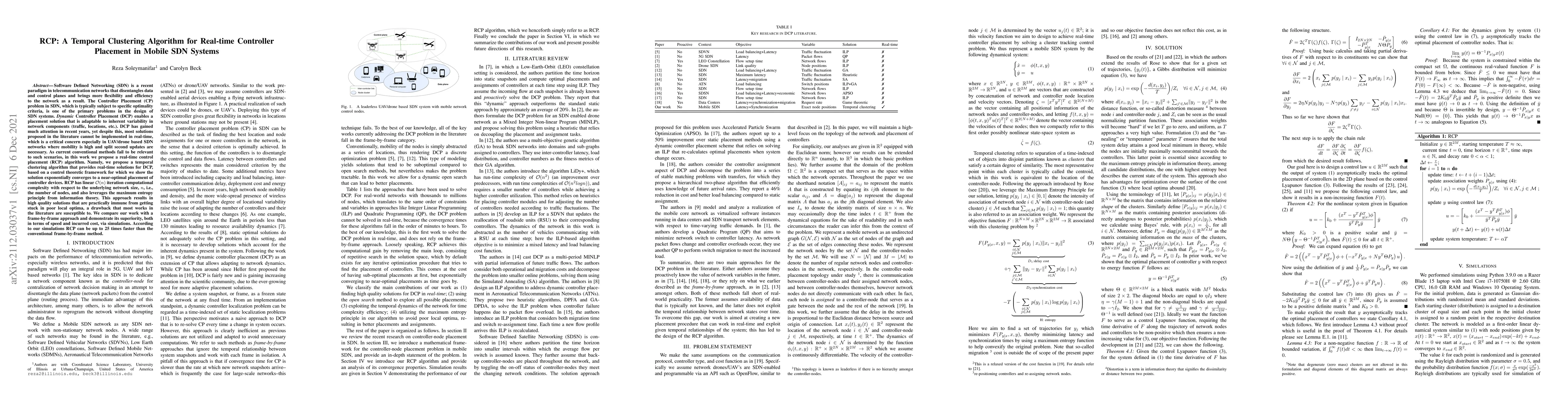 This paper proposes a real-time Controller Placement (RCP) algorithm called RCP: A Temporal Clustering Algorithm for Real-time Controller Placement in Mobile SDN Systems. The algorithm leverages temporal clustering and control theory to achieve near-optimal placement in dynamic environments, with linear computational complexity and high-quality solutions that avoid local optima. Simulations show RCP can be up to 25 times faster than conventional frame-by-frame methods.