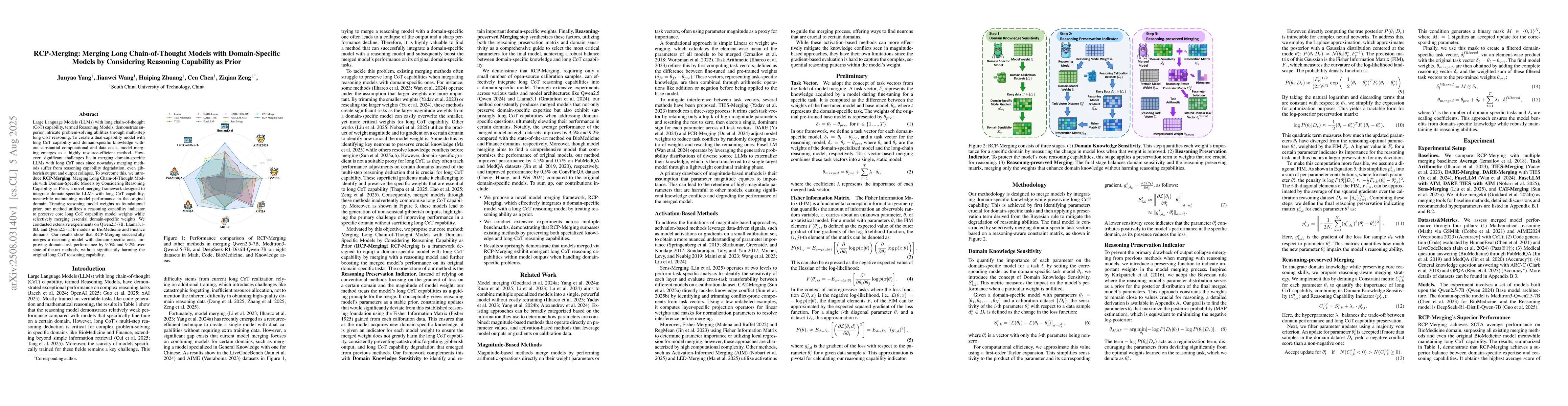 Large Language Models (LLMs) with long chain-of-thought (CoT) capability, termed Reasoning Models, demonstrate superior intricate problem-solving abilities through multi-step long CoT reasoning. To create a dual-capability model with long CoT capability and domain-specific knowledge without substantial computational and data costs, model merging emerges as a highly resource-efficient method. However, significant challenges lie in merging domain-specific LLMs with long CoT ones since nowadays merging methods suffer from reasoning capability degradation, even gibberish output and output collapse. To overcome this, we introduce RCP-Merging: Merging Long Chain-of-Thought Models with Domain-Specific Models by Considering Reasoning Capability as Prior, a novel merging framework designed to integrate domain-specific LLMs with long CoT capability, meanwhile maintaining model performance in the original domain. Treating reasoning model weights as foundational prior, our method utilizes a reasoning capability indicator to preserve core long CoT capability model weights while selectively merging essential domain-specific weights. We conducted extensive experiments on Qwen2.5-7B, Llama3.1-8B, and Qwen2.5-1.5B models in BioMedicine and Finance domains. Our results show that RCP-Merging successfully merges a reasoning model with domain-specific ones, improving domain task performance by 9.5% and 9.2% over state-of-the-art methods, without significantly harming the original long CoT reasoning capability.