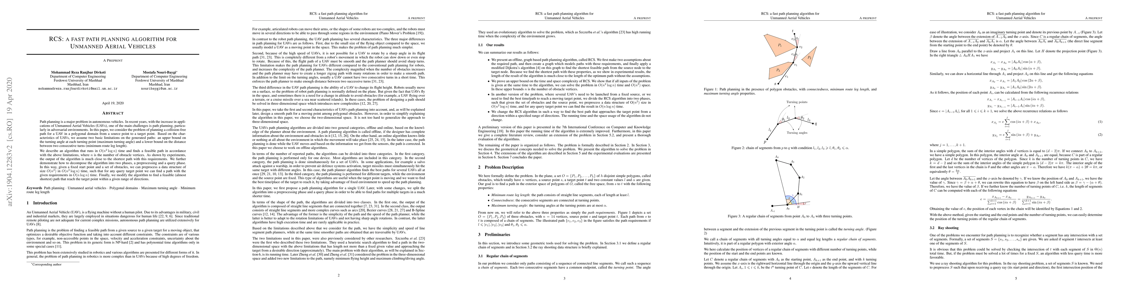 This paper introduces RCS, a fast path planning algorithm for Unmanned Aerial Vehicles (UAVs) that operates in $O(n^2 \log n)$ time to find collision-free paths within polygonal domains, adhering to maximum turning angle and minimum route leg length constraints. The algorithm is further optimized into preprocessing and query phases for efficient pathfinding.