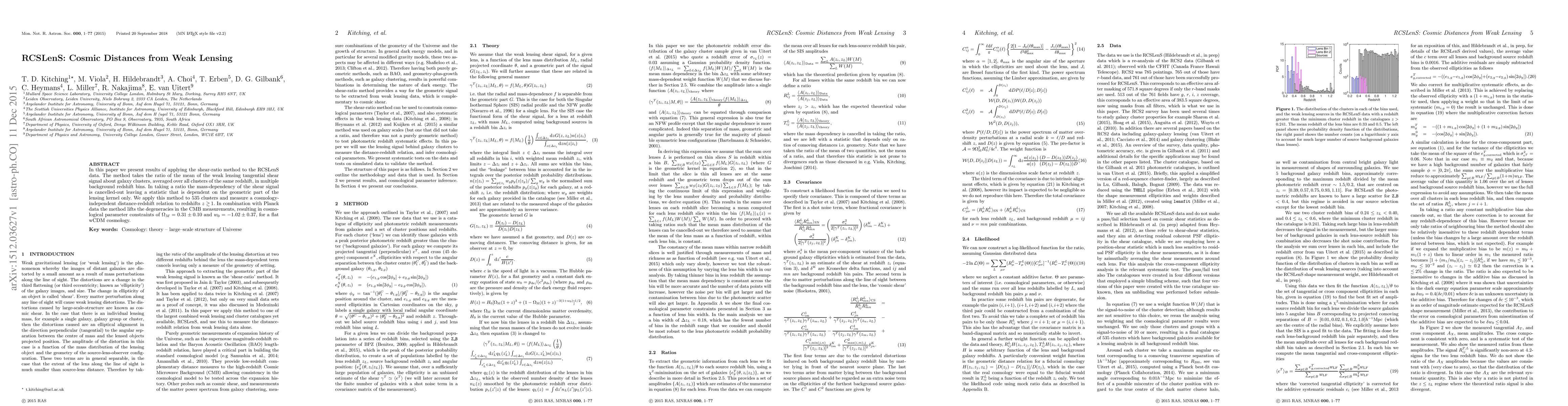 RCSLenS uses the shear-ratio method to measure cosmic distances from weak lensing, cancelling mass-dependency to derive a geometry-based statistic. Combined with Planck data, it provides cosmology-independent distance-redshift relations and constrains cosmological parameters to OmegaM=0.31 +/- 0.10 and w0 = -1.02 +/- 0.37.