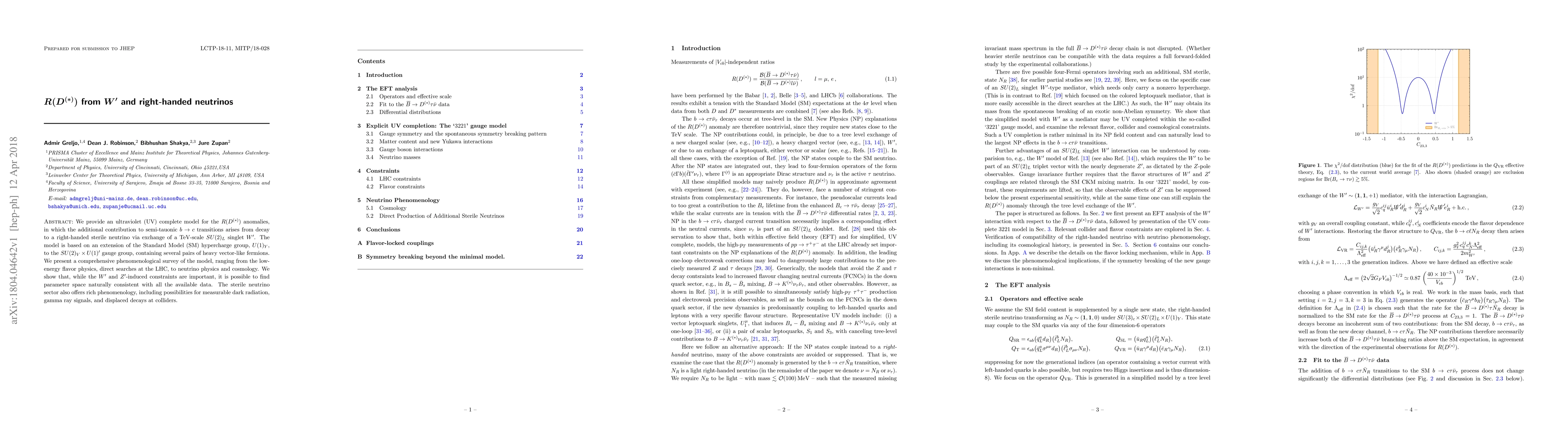 We provide an ultraviolet (UV) complete model for the $R(D^{(*)})$ anomalies, in which the additional contribution to semi-tauonic $b \to c$ transitions arises from decay to a right-handed sterile neutrino via exchange of a TeV-scale $SU(2)_L$ singlet $W'$. The model is based on an extension of the Standard Model (SM) hypercharge group, $U(1)_Y$, to the $SU(2)_V\times U(1)'$ gauge group, containing several pairs of heavy vector-like fermions. We present a comprehensive phenomenological survey of the model, ranging from the low-energy flavor physics, direct searches at the LHC, to neutrino physics and cosmology. We show that, while the $W'$ and $Z'$-induced constraints are important, it is possible to find parameter space naturally consistent with all the available data. The sterile neutrino sector also offers rich phenomenology, including possibilities for measurable dark radiation, gamma ray signals, and displaced decays at colliders.