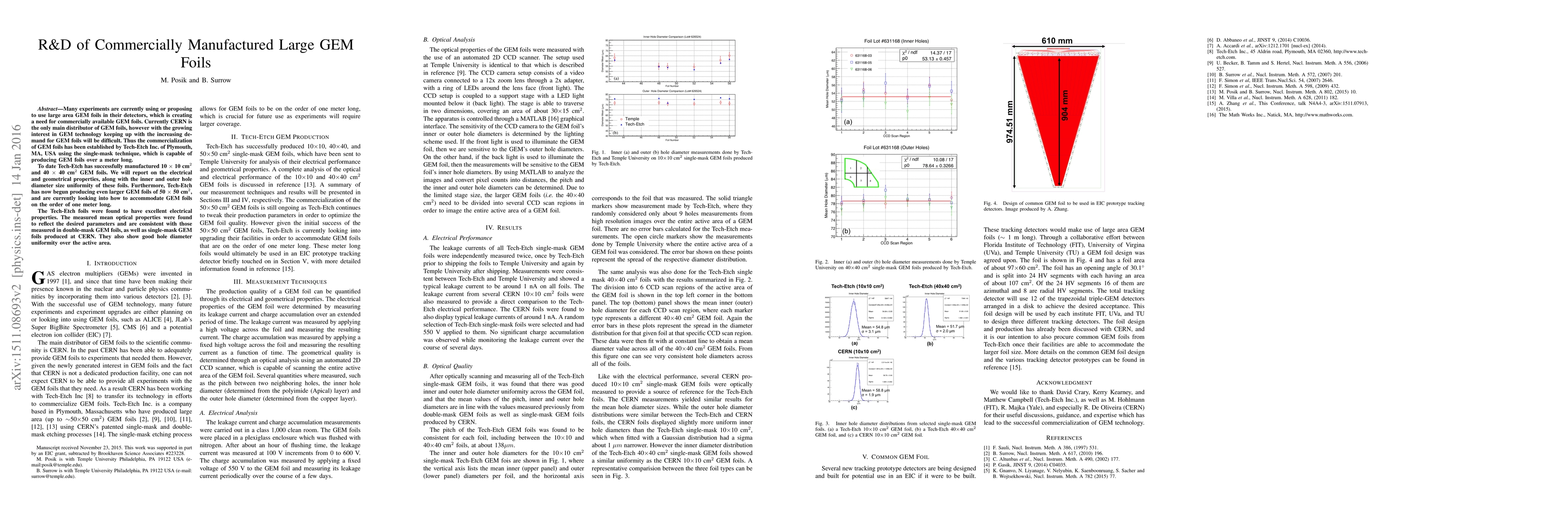 The research details the successful production of large area GEM foils using the single-mask technique by Tech-Etch Inc., capable of manufacturing foils over a meter long. Electrical and geometrical properties, along with inner and outer hole diameter size uniformity, were reported for 10×10 cm², 40×40 cm², and 50×50 cm² GEM foils.