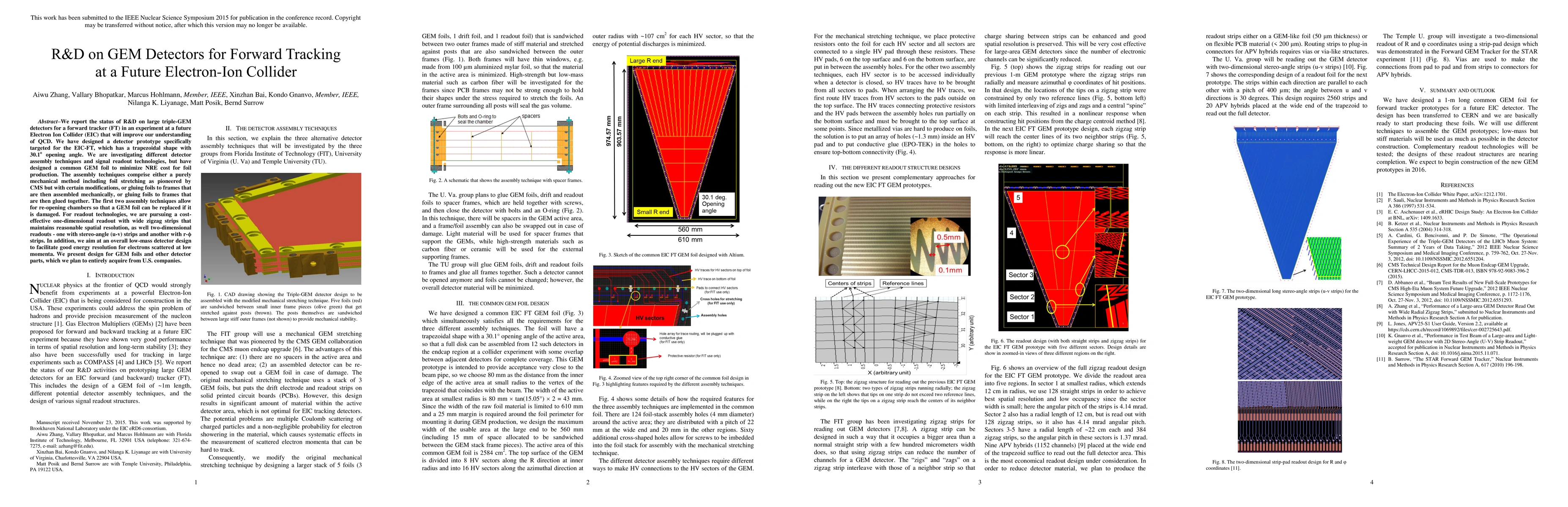 We report the status of R&D on large triple-GEM detectors for a forward tracker (FT) in an experiment at a future Electron Ion Collider (EIC) that will improve our understanding of QCD. We have designed a detector prototype specifically targeted for the EIC-FT, which has a trapezoidal shape with 30.1 degrees opening angle. We are investigating different detector assembly techniques and signal readout technologies, but have designed a common GEM foil to minimize NRE cost for foil production. The assembly techniques comprise either a purely mechanical method including foil stretching as pioneered by CMS but with certain modifications, or gluing foils to frames that are then assembled mechanically, or gluing foils to frames that are then glued together. The first two assembly techniques allow for re-opening chambers so that a GEM foil can be replaced if it is damaged. For readout technologies, we are pursuing a cost-effective one-dimensional readout with wide zigzag strips that maintains reasonable spatial resolution, as well two-dimensional readouts - one with stereo-angle (u-v) strips and another with r-phi strips. In addition, we aim at an overall low-mass detector design to facilitate good energy resolution for electrons scattered at low momenta. We present design for GEM foils and other detector parts, which we plan to entirely acquire from U.S. companies.