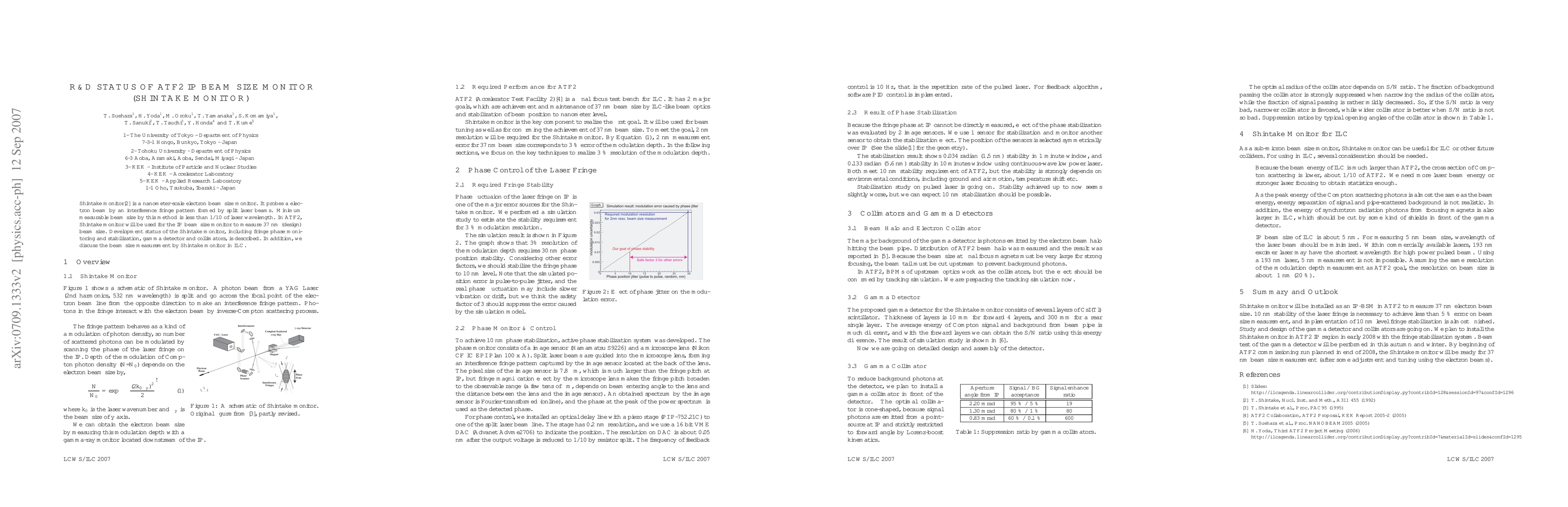 Shintake monitor is a nanometer-scale electron beam size monitor. It probes a electron beam by an interference fringe pattern formed by split laser beams. Minimum measurable beam size by this method is less than 1/10 of laser wavelength. In ATF2, Shintake monitor will be used for the IP beam size monitor to measure 37 nm (design) beam size. Development status of the Shintake monitor, including fringe phase monitoring and stabilization, gamma detector and collimators, is described. In addition, we discuss the beam size measurement by Shintake monitor in ILC.