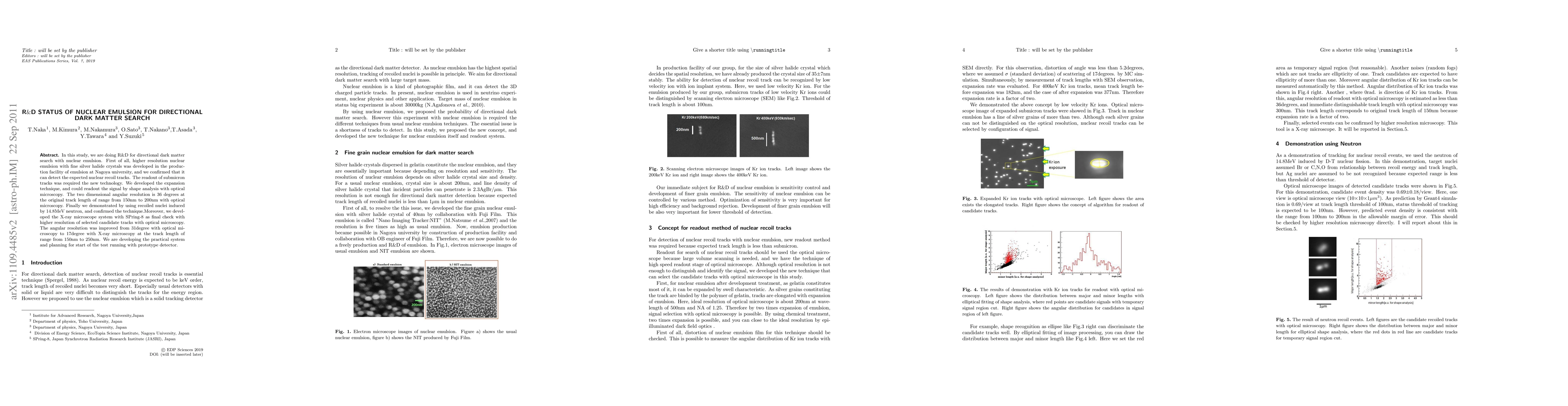 In this study, we are doing R&D for directional dark matter search with nuclear emulsion. First of all, higher resolution nuclear emulsion with fine silver halide crystals was developed in the production facility of emulsion at Nagoya university, and we confirmed that it can detect the expected nuclear recoil tracks. The readout of submicron tracks was required the new technology. We developed the expansion technique, and could readout the signal by shape analysis with optical microscopy. The two dimensional angular resolution is 36 degrees at the original track length of range from 150nm to 200nm with optical microscopy. Finally we demonstrated by using recoiled nuclei induced by 14.8MeV neutron, and confirmed the technique.Moreover, we developed the X-ray microscope system with SPring-8 as final check with higher resolution of selected candidate tracks with optical microscopy. The angular resolution was improved from 31 degrees with optical microscopy to 17degrees with X-ray microscopy at the track length of range from 150nm to 250nm. We are developing the practical system and planning for start of the test running with prototype detector.