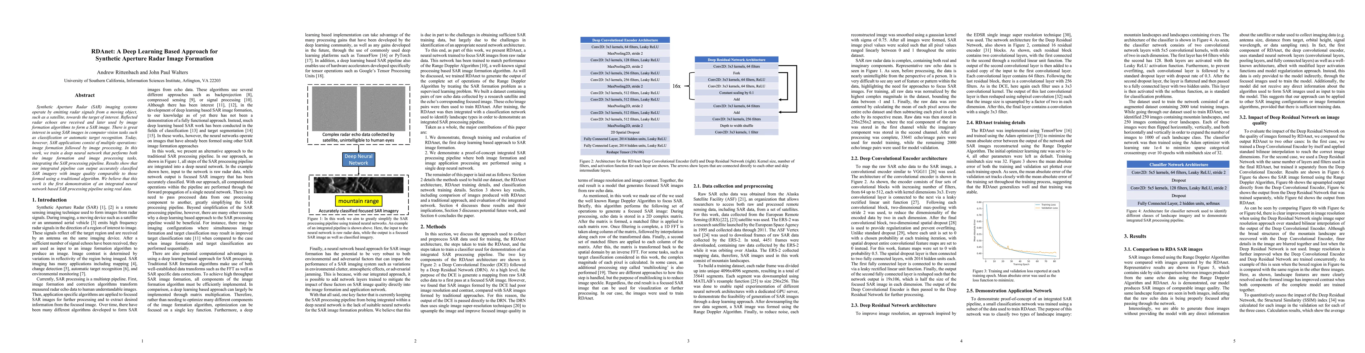 RDAnet employs a deep learning approach to integrate synthetic aperture radar (SAR) image formation and processing into a single neural network, achieving accurate classification and image quality comparable to traditional methods. This work presents the first neural network-based integrated SAR processing pipeline using real data.