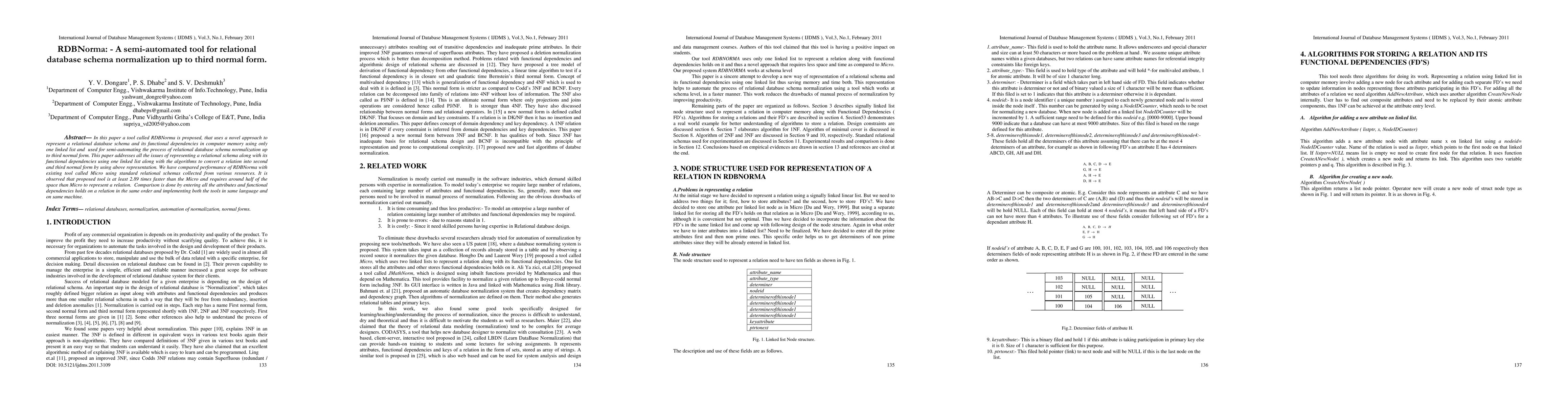 RDBNorma is a semi-automated tool for normalizing relational database schemas up to third normal form using a single linked list representation. It outperforms the existing Micro tool by being 2.89 times faster and requiring half the memory.