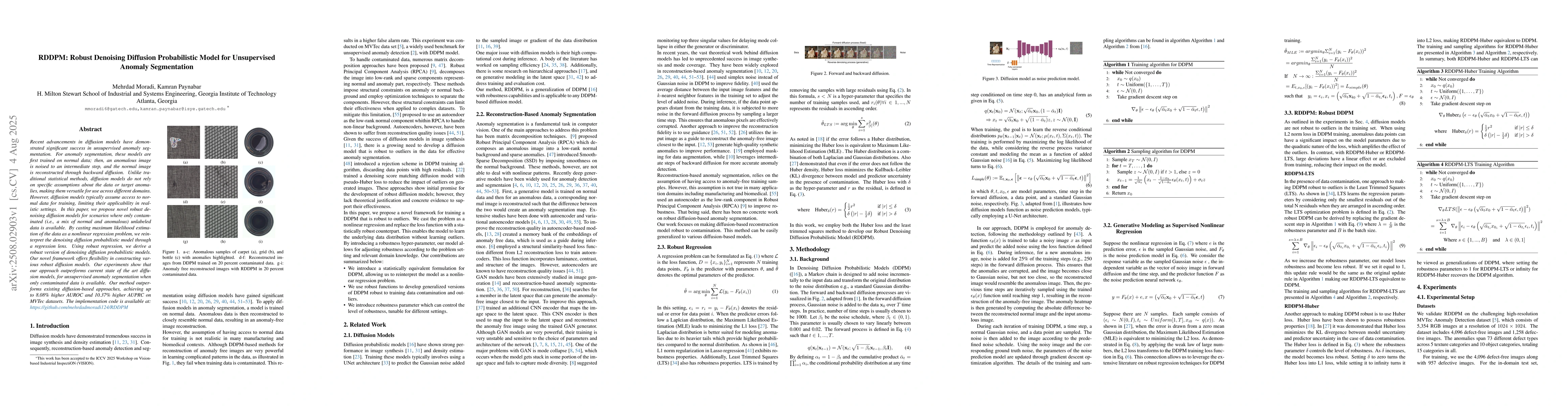 Recent advancements in diffusion models have demonstrated significant success in unsupervised anomaly segmentation. For anomaly segmentation, these models are first trained on normal data; then, an anomalous image is noised to an intermediate step, and the normal image is reconstructed through backward diffusion. Unlike traditional statistical methods, diffusion models do not rely on specific assumptions about the data or target anomalies, making them versatile for use across different domains. However, diffusion models typically assume access to normal data for training, limiting their applicability in realistic settings. In this paper, we propose novel robust denoising diffusion models for scenarios where only contaminated (i.e., a mix of normal and anomalous) unlabeled data is available. By casting maximum likelihood estimation of the data as a nonlinear regression problem, we reinterpret the denoising diffusion probabilistic model through a regression lens. Using robust regression, we derive a robust version of denoising diffusion probabilistic models. Our novel framework offers flexibility in constructing various robust diffusion models. Our experiments show that our approach outperforms current state of the art diffusion models, for unsupervised anomaly segmentation when only contaminated data is available. Our method outperforms existing diffusion-based approaches, achieving up to 8.08\% higher AUROC and 10.37\% higher AUPRC on MVTec datasets. The implementation code is available at: https://github.com/mehrdadmoradi124/RDDPM