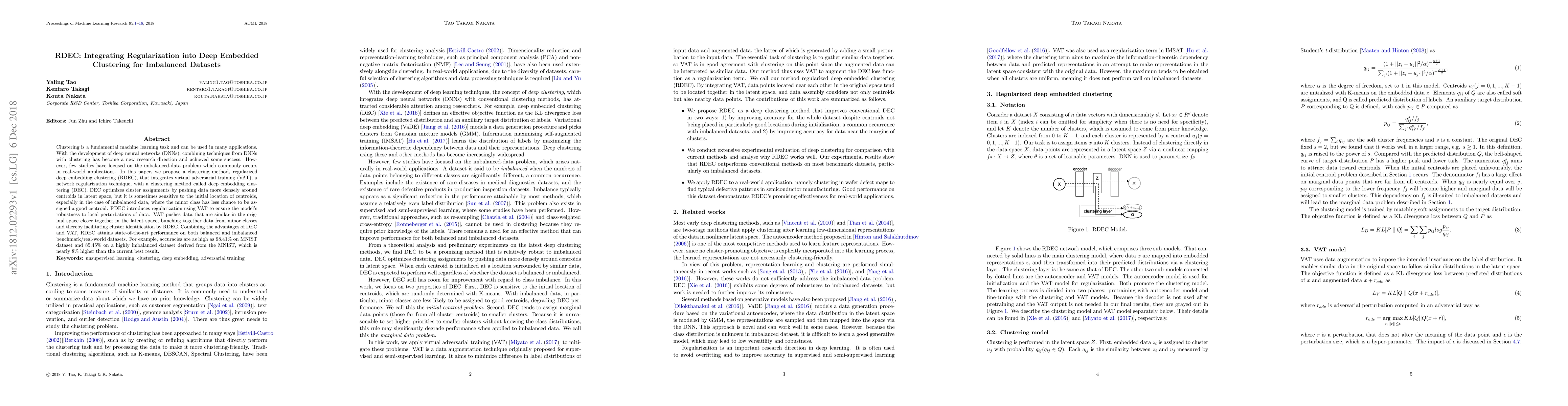 The paper proposes RDEC, a method that integrates regularization via virtual adversarial training with deep embedding clustering to address the imbalanced-data problem. RDEC enhances cluster identification by pushing similar data closer in latent space, achieving state-of-the-art performance on both balanced and imbalanced datasets.