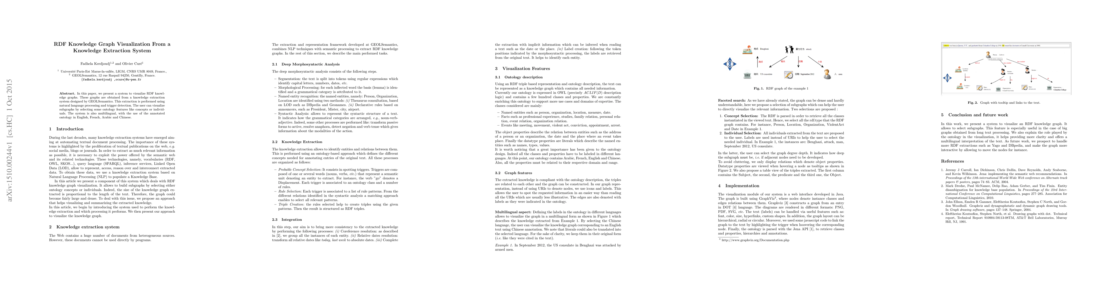 This paper introduces a system for visualizing RDF knowledge graphs derived from GEOLSemantics' knowledge extraction, utilizing NLP and trigger detection. It allows users to select ontology features and supports multilingual visualization using annotated ontology in English, French, Arabic, and Chinese.