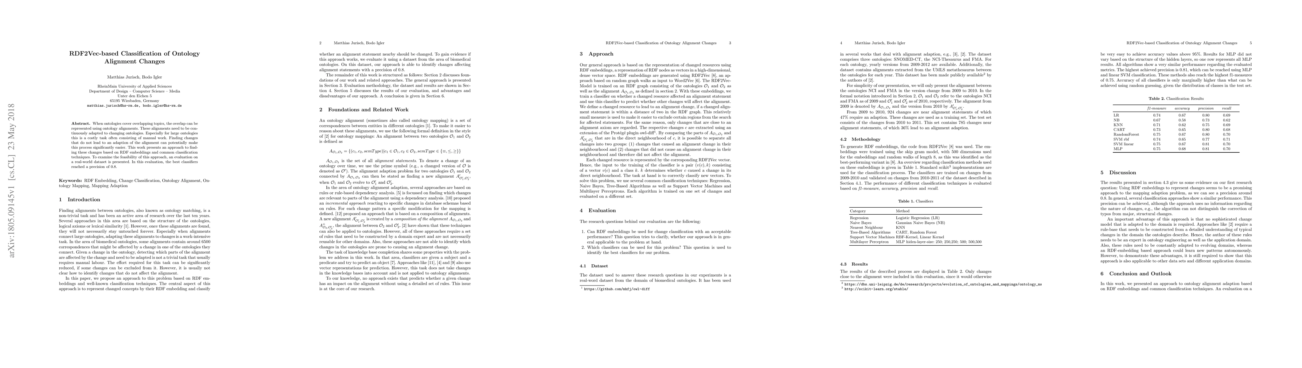 When ontologies cover overlapping topics, the overlap can be represented using ontology alignments. These alignments need to be continuously adapted to changing ontologies. Especially for large ontologies this is a costly task often consisting of manual work. Finding changes that do not lead to an adaption of the alignment can potentially make this process significantly easier. This work presents an approach to finding these changes based on RDF embeddings and common classification techniques. To examine the feasibility of this approach, an evaluation on a real-world dataset is presented. In this evaluation, the best classifiers reached a precision of 0.8.