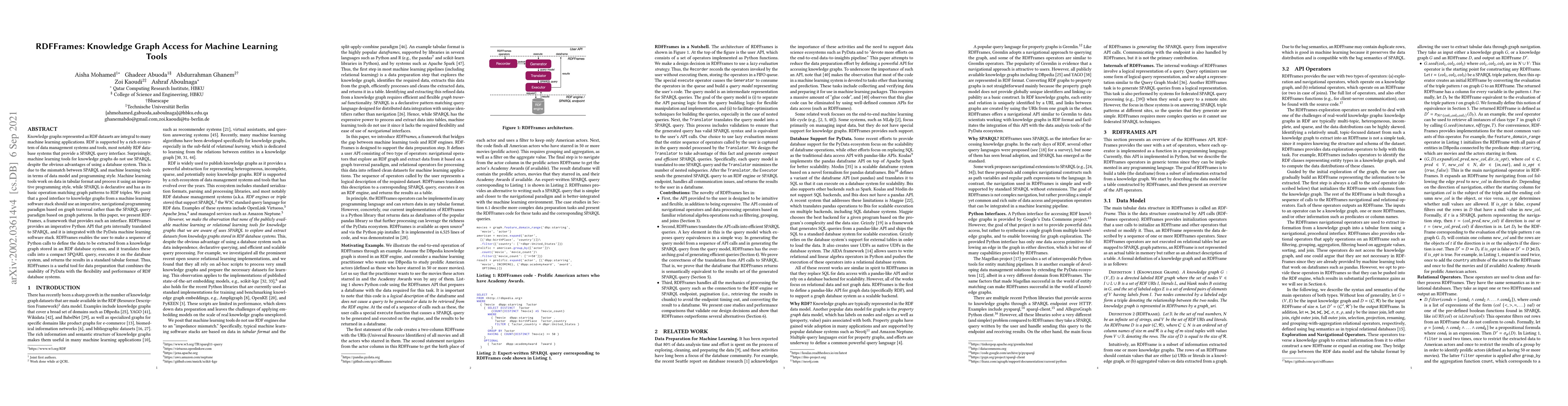 RDFFrames presents an imperative Python API for accessing knowledge graphs stored in RDF databases, bridging the gap between machine learning tools and SPARQL. It translates Python graph traversal calls into optimized SPARQL queries for efficient data extraction.