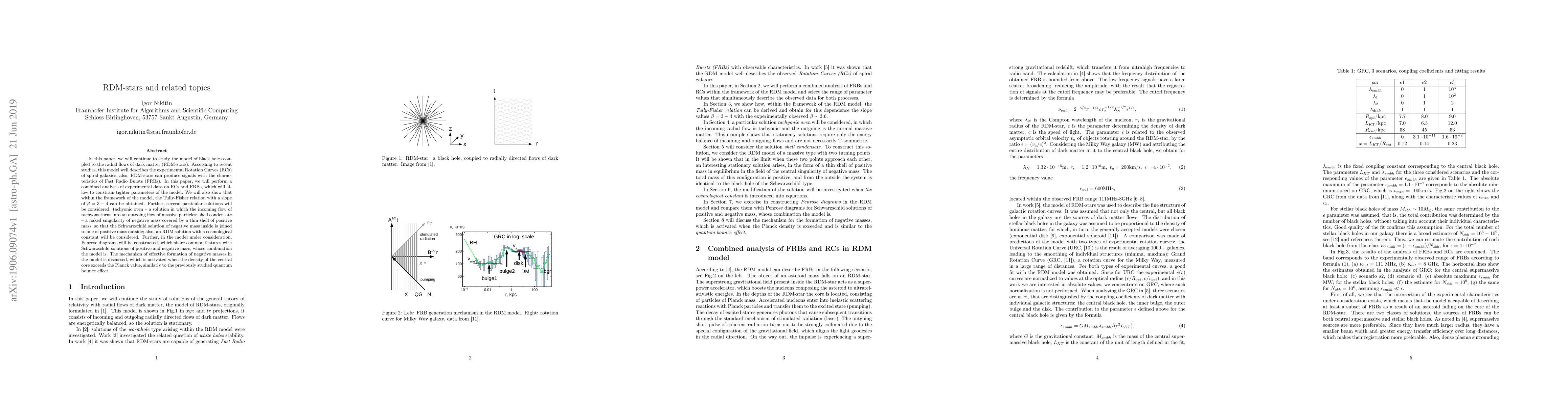 In this paper, we will continue to study the model of black holes coupled to the radial flows of dark matter (RDM-stars). According to recent studies, this model well describes the experimental Rotation Curves (RCs) of spiral galaxies, also, RDM-stars can produce signals with the characteristics of Fast Radio Bursts (FRBs). In this paper, we will perform a combined analysis of experimental data on RCs and FRBs, which will allow to constrain tighter parameters of the model. We will also show that within the framework of the model, the Tully-Fisher relation with a slope of $ \beta = 3-4 $ can be obtained. Further, several particular solutions will be considered: tachyonic oven -- a solution in which the incoming flow of tachyons turns into an outgoing flow of massive particles; shell condensate -- a naked singularity of negative mass covered by a thin shell of positive mass, so that the Schwarzschild solution of negative mass inside is joined to one of positive mass outside; also, an RDM solution with a cosmological constant will be considered. Further, in the model under consideration, Penrose diagrams will be constructed, which share common features with Schwarzschild solutions of positive and negative mass, whose combination the model is. The mechanism of effective formation of negative masses in the model is discussed, which is activated when the density of the central core exceeds the Planck value, similarly to the previously studied quantum bounce effect.