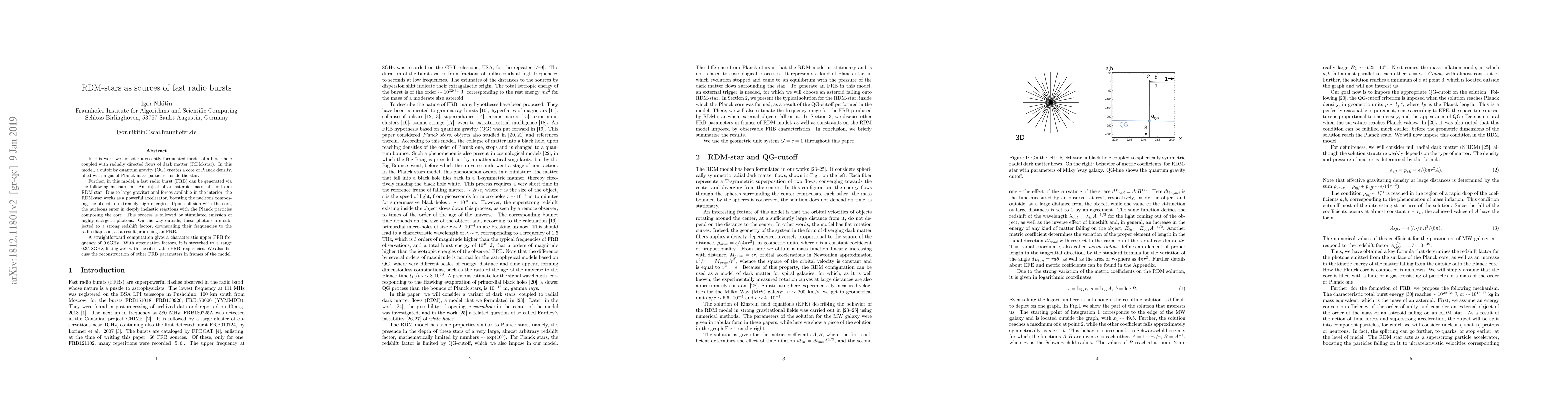 This paper explores a model where RDM-stars, black holes coupled with radially directed dark matter flows, can generate fast radio bursts (FRBs). The mechanism involves an asteroid colliding with the star, accelerating nucleons to high energies, and producing FRBs through interactions with a core of Planck mass particles.