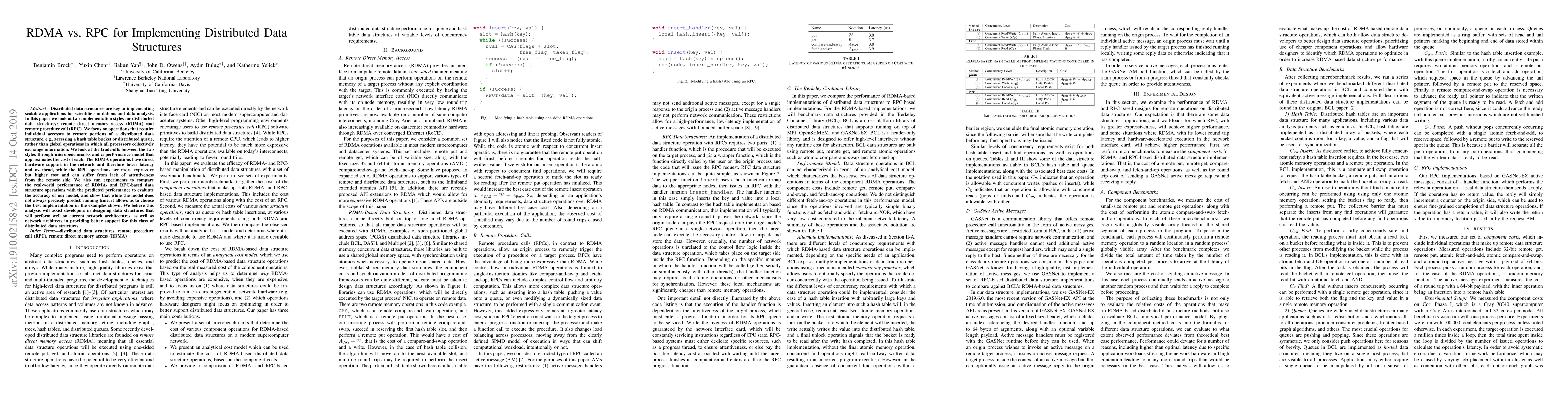 This paper compares RDMA and RPC for implementing distributed data structures, finding that RDMA offers lower latency and overhead due to direct hardware support, while RPC is more expressive but incurs higher costs. The study validates a performance model to predict the effectiveness of each method, aiding developers in optimizing data structures for current network architectures.
