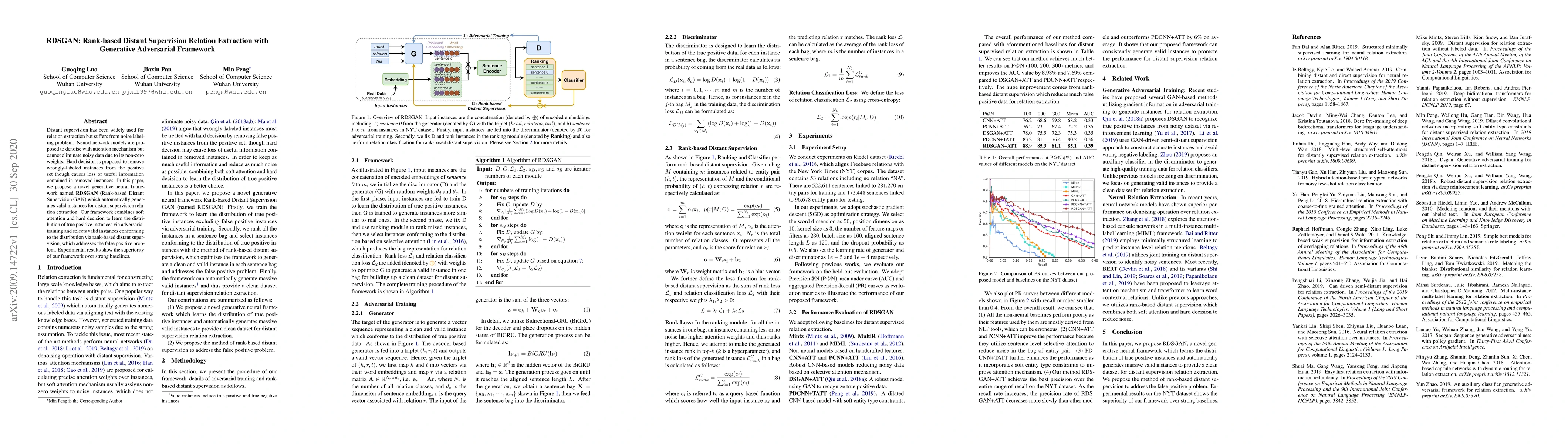 RDSGAN addresses the noise labeling issue in distant supervision for relation extraction by combining generative adversarial training with rank-based distant supervision. It effectively identifies and generates valid instances, outperforming strong baselines in denoising and maintaining useful information.