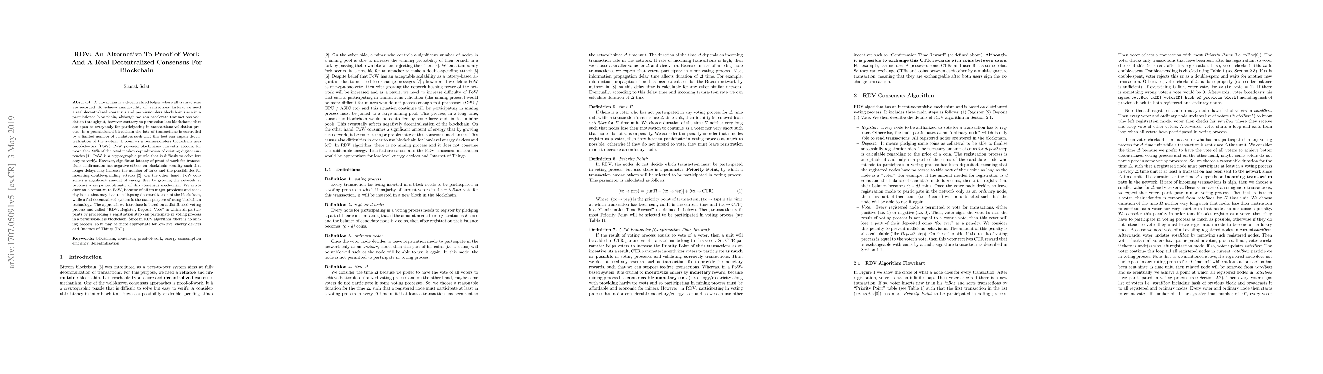 This paper proposes RDV, an alternative to proof-of-work for blockchain consensus, addressing its latency and energy consumption issues. RDV utilizes a distributed voting process, making it suitable for decentralized systems and low-energy devices like IoT.