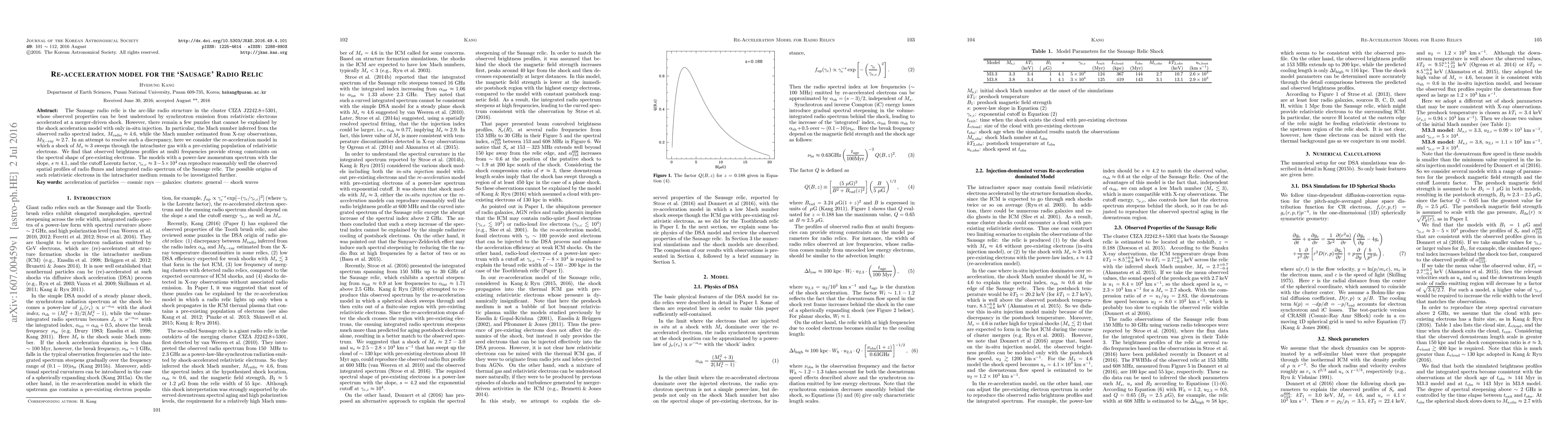 This paper proposes a re-acceleration model to explain the Sausage radio relic in cluster CIZA J2242.8+5301, addressing discrepancies between inferred Mach numbers from radio and X-ray observations. The proposed model suggests a shock with Mach number ~3 re-accelerates pre-existing relativistic electrons, fitting observed brightness profiles and spectral shapes.