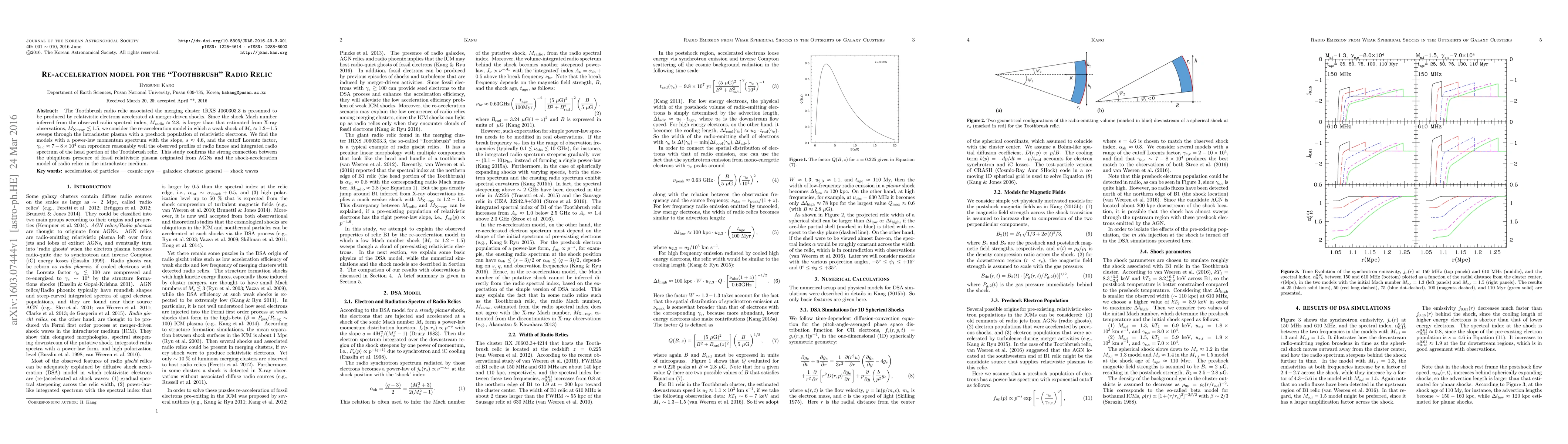 A re-acceleration model explains the formation of the 'Toothbrush' radio relic by a weak shock sweeping through intracluster plasma with relativistic electrons, reproducing observed radio fluxes and spectra.