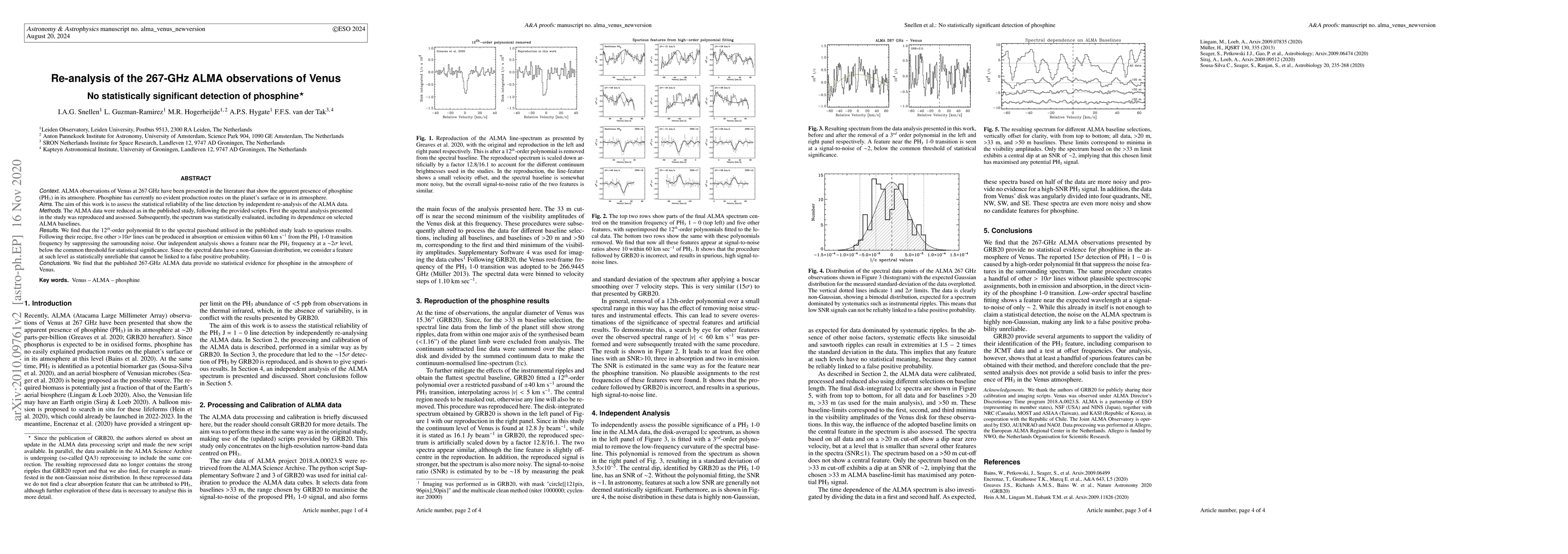 Context: ALMA observations of Venus at 267 GHz have been presented in the literature that show the apparent presence of phosphine (PH3) in its atmosphere. Phosphine has currently no evident production routes on the planet's surface or in its atmosphere. Aims: The aim of this work is to assess the statistical reliability of the line detection by independent re-analysis of the ALMA data. Methods: The ALMA data were reduced as in the published study, following the provided scripts. First the spectral analysis presented in the study was reproduced and assessed. Subsequently, the spectrum was statistically evaluated, including its dependence on selected ALMA baselines. Results: We find that the 12th-order polynomial fit to the spectral passband utilised in the published study leads to spurious results. Following their recipe, five other >10 sigma lines can be produced in absorption or emission within 60 km/s from the PH3 1-0 transition frequency by suppressing the surrounding noise. Our independent analysis shows a feature near the PH3 frequency at a ~2 sigma level, below the common threshold for statistical significance. Since the spectral data have a non-Gaussian distribution, we consider a feature at such level as statistically unreliable that cannot be linked to a false positive probability. Conclusions: We find that the published 267-GHz ALMA data provide no statistical evidence for phosphine in the atmosphere of Venus.