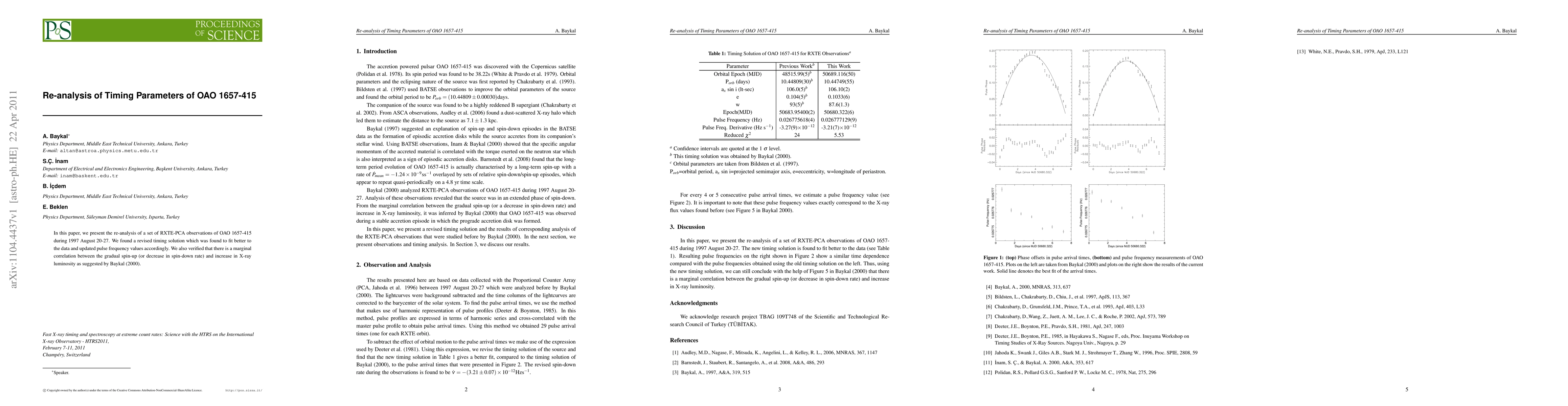 Researchers re-analyzed data from 1997 RXTE-PCA observations of OAO 1657-415, finding a revised timing solution that better fits the data and confirming correlations between spin-up rates and X-ray luminosity.